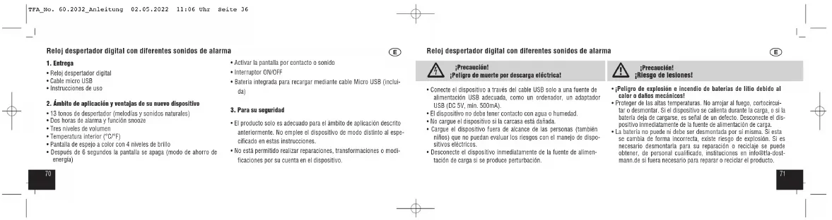 - La batería no puede ni debe ser desmontada por sí misma. Si esta se cambia de forma incorrecta, existe riesgo de explosión. Si es necesario desmontarla para su reparación o reciclaje se puede obtener, de personal cualificado, instituciones en info@tfa-dost- mann.de si fuera necesario para reparar o reciclar el producto. TFA_No. 60.2032_Anleitung 02.05.2022 11:06 Uhr Seite 367372 Reloj despertador digital con diferentes sonidos de alarma