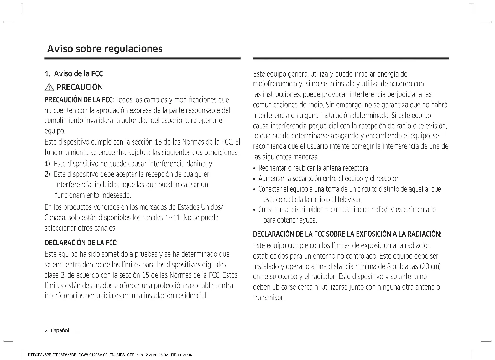DTI30P876BB,DTI36P876BB_DG68-01296A-00_EN+MES+CFR.indb 1 2020-06-02 11:21:042 Español Aviso sobre regulaciones Este equipo genera, utiliza y puede irradiar energía de radiofrecuencia y, si no se lo instala y utiliza de acuerdo con las instrucciones, puede provocar interferencia perjudicial a las comunicaciones de radio. Sin embargo, no se garantiza que no habrá interferencia en alguna instalación determinada. Si este equipo causa interferencia perjudicial con la recepción de radio o televisión, lo que puede determinarse apagando y encendiendo el equipo, se recomienda que el usuario intente corregir la interferencia de una de las siguientes maneras:
