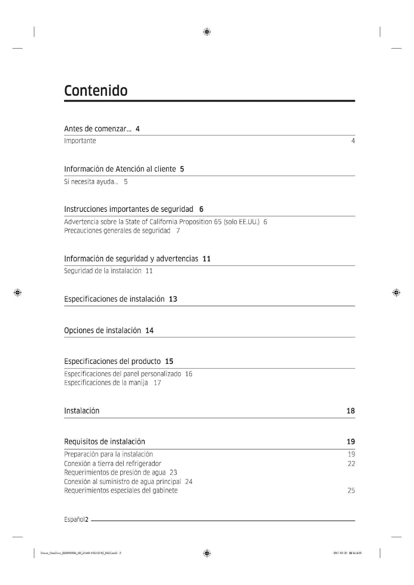 - Conserve este manual para referencia personal y para referencia de inspectores, personal de servicio, etc. Dacor_OneDoor_BRR9000M_IM_DA68-03621B-02_MES.indd 4 2017-03-20 4:14:00GUARDE ESTAS INSTRUCCIONES Español 5 Información de Atención al cliente Si necesita ayuda... Si desea hacer alguna pregunta o tiene un problema con la instalación, comuníquese con su distribuidor de Dacor® o con el equipo de Atención al cliente de Dacor. Si su electrodoméstico Dacor se encuentra en garantía, comuníquese con Dacor Distinctive Service. Tenga el modelo/ número de serie del electrodoméstico a mano al llamar. (Estos números se encuentran en la etiqueta informativa ubicada en el marco interno de la puerta derecha del refrigerador). Dacor Distinctive Service (solo para reparaciones de electrodomésticos en garantía) Teléfono: (800) 793-0093 int. 2822 (EE.UU. y Canadá) Lunes a viernes de 6:00 a.m. a 4:00 p.m. Hora del Pacífico Servicio de atención al cliente de Dacor Teléfono: (800) 793-0093 int. 2813 (EE.UU. y Canadá) Lunes a viernes de 6:00 a.m. a 5:00 p.m. Hora del Pacífico Sitio web: www.dacor.com Todas las especificaciones están sujetas a cambios sin previo aviso. Dacor no asume responsabilidad alguna por los cambios en las especificaciones. © 2017 Dacor, todos los derechos reservados. Dacor_OneDoor_BRR9000M_IM_DA68-03621B-02_MES.indd 5 2017-03-20 4:14:00GUARDE ESTAS INSTRUCCIONES Español6 Instrucciones importantes de seguridad Las instrucciones importantes de seguridad y las advertencias que aparecen en estas instrucciones no tienen por objeto cubrir todos los posibles problemas y condiciones que puedan ocurrir.Utilice el sentido común y tenga precaución al instalar, mantener u operar este o cualquier otro electrodoméstico.Siempre póngase en contacto con el equipo de servicio al cliente de Dacor por cualquier problema o condiciones que no entienda. Consulte Información de Atención al cliente. Etiquetas y símbolos de seguridad Estas alertas están destinadas a llamar la atención sobre áreas importantes en el manual.Siempre que vea estos símbolos o etiquetas, lea el mensaje atentamente antes de continuar. PELIGRO Riesgos inminentes que CAUSARÁN lesiones físicas graves o la muerte. ADVERTENCIA Riesgos o prácticas inseguras que PUEDEN causar lesiones físicas graves o la muerte. PRECAUCIÓN Riesgos o prácticas inseguras que PODRÍAN causar lesiones físicas leves o daños materiales. Advertencia sobre la State of California Proposition 65 (solo EE.UU.) ADVERTENCIA : Este producto contiene productos químicos reconocidos en el estado de California como capaces de provocar cáncer y defectos de nacimiento u otras afecciones reproductivas.Dacor_OneDoor_BRR9000M_IM_DA68-03621B-02_MES.indd 6 2017-03-20 4:14:00GUARDE ESTAS INSTRUCCIONES Español 7 ADVERTENCIA - Refrigerante R600a Este dispositivo contiene refrigerante de isobutano, R600a, un gas natural con alta compatibilidad ambiental. Sin embargo, también es inflamable. Sírvase cumplir con las siguientes advertencias: