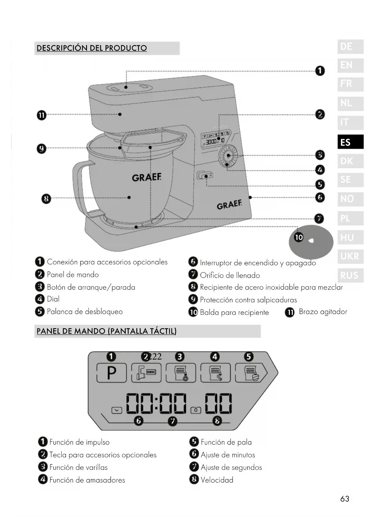 Brazo agitador64 PRÓLOGO Estimado/a cliente: Ha tomado una buena decisión con este robot de cocina. Ha adquirido un producto de cali- dad reconocido. Le agradecemos su compra y deseamos que disfrute durante mucho tiempo de su nuevo robot de cocina. INFORMACIÓN ACERCA DEL PRESENTE MANUAL DE INSTRUCCIONES El presente manual de instrucciones forma parte del robot de cocina (denominado de ahora en adelante, aparato) y aporta información esencial para la puesta en marcha, la seguridad, el uso previsto y la conservación del aparato. El manual de instrucciones debe guardarse siempre a mano, cerca del aparato. Debe ser leído y utilizado por la persona encargada de: ● La puesta en marcha, ● El manejo, ● la resolución de fallos; y/o ● Limpieza Conserve el presente manual de instrucciones y facilítelo junto con el aparato a las terceras personas que vayan a utilizarlo en el futuro. Este manual de instrucciones no puede tener en cuenta todos los aspectos imaginables. Para más información o en caso de problemas que no se traten en este manual de instrucciones o no se traten con suficiente detalle, diríjase al servicio de atención al cliente de Graef o a su distribuidor especializado. ADVERTENCIAS En el presente manual de instrucciones se utilizan las siguientes advertencias y palabras de advertencia: ADVERTENCIA Indica una situación potencialmente peligrosa. El incumplimiento de esta indicación puede producir lesiones de gravedad o provocar incluso la muerte. ATENCIÓN Indica una situación potencialmente peligrosa. En caso de incumplimiento de la indicación se pueden producir daños materiales. ¡IMPORTANTE! Indica consejos de uso y otras informaciones de especial importancia.65