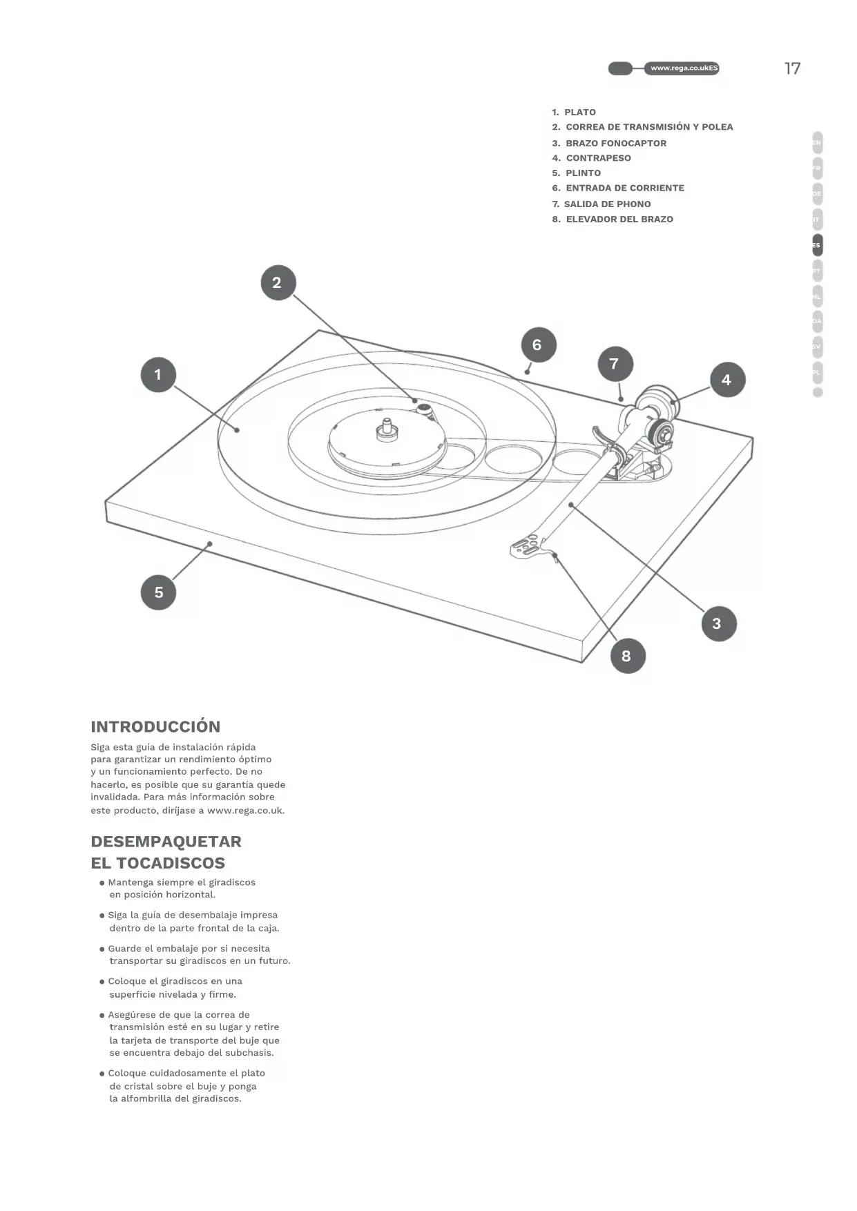 INTRODUCCIÓN Siga esta guía de instalación rápida para garantizar un rendimiento óptimo y un funcionamiento perfecto. De no hacerlo, es posible que su garantía quede invalidada. Para más información sobre este producto, diríjase a www.rega.co.uk. DESEMPAQUETAR EL TOCADISCOS ● Mantenga siempre el giradiscos en posición horizontal. ● Siga la guía de desembalaje impresa dentro de la parte frontal de la caja. ● Guarde el embalaje por si necesita transportar su giradiscos en un futuro. ● Coloque el giradiscos en una superficie nivelada y firme. ● Asegúrese de que la correa de transmisión esté en su lugar y retire la tarjeta de transporte del buje que se encuentra debajo del subchasis. ● Coloque cuidadosamente el plato de cristal sobre el buje y ponga la alfombrilla del giradiscos.