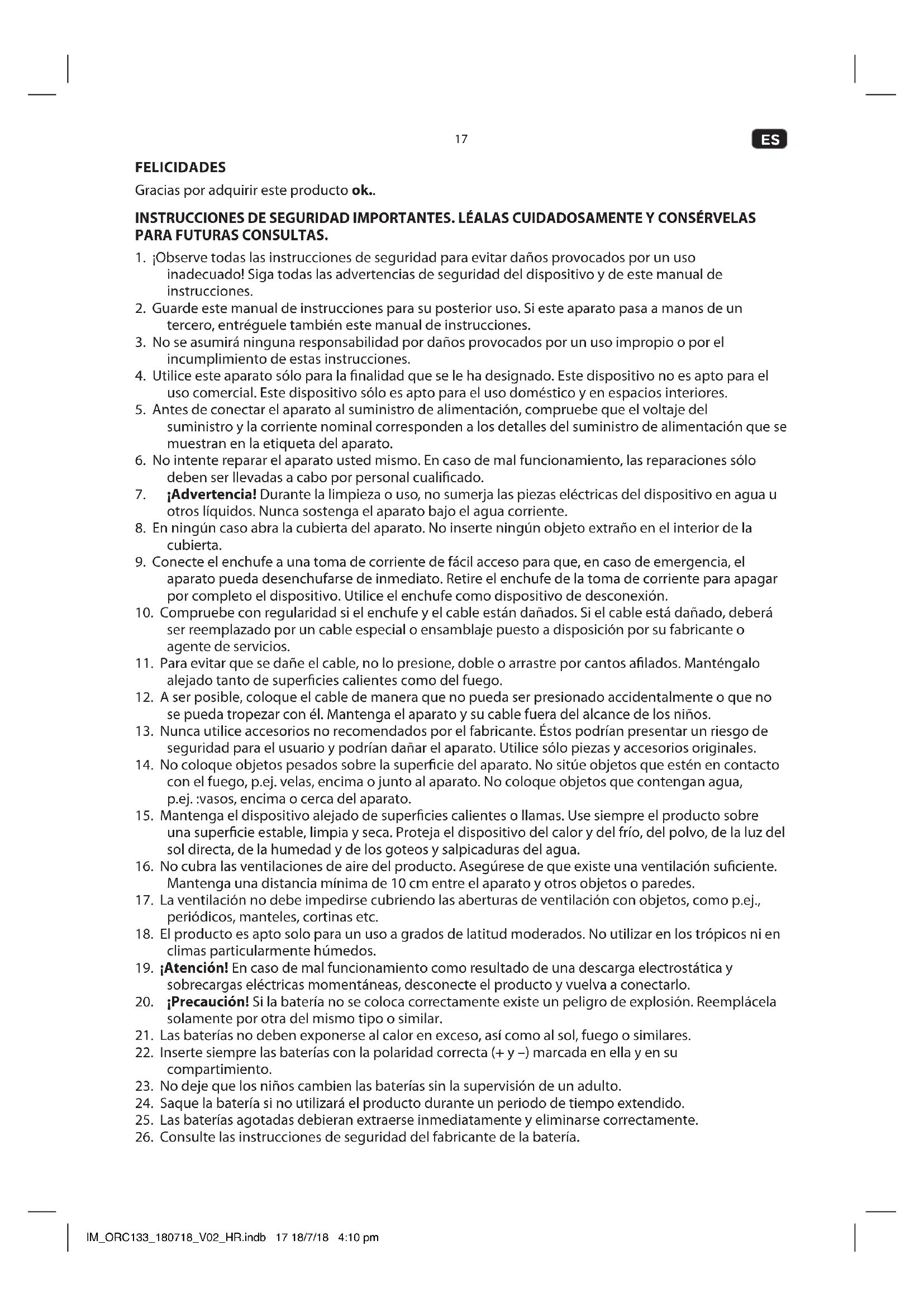 Por la presente, [Intron GmbH] declara que el tipo de equipo radioeléctrico [ORC 130-B / ORC 133-W / ORC 133-R / ORC 133-BL / ORC 133-PK / ORC 133-GR] es conforme con la Directiva 2014/53/UE. El texto completo de la declaración UE de conformidad está disponible en la dirección Internet siguiente: http://de.ok-online.com/nc/de/suche.html ELIMINACIÓN La imagen del contenedor de basura tachado, indica la recogida selectiva de residuos eléctricos y electrónicos (RAEE). El material eléctrico y electrónico puede contener sustancias peligrosas. No coloque este aparato como residuo junto a la basura doméstica. Devuélvalo a un punto de recogida designado para el reciclaje de RAEE. De este modo, ayudará a conservar recursos y a proteger el medio ambiente. Para más información, póngase en contacto con su distribuidor o sus autoridades locales. Deshágase de las pilas de forma respetuosa con el medioambiente. No tire las pilas junto con los residuos domésticos del hogar. Utilice los sistemas de devolución y recogida de su comunidad o póngase en contacto con el vendedor al que compró el producto. IM_ORC133_180718_V02_HR.indb 23 18/7/18 4:10 pm24