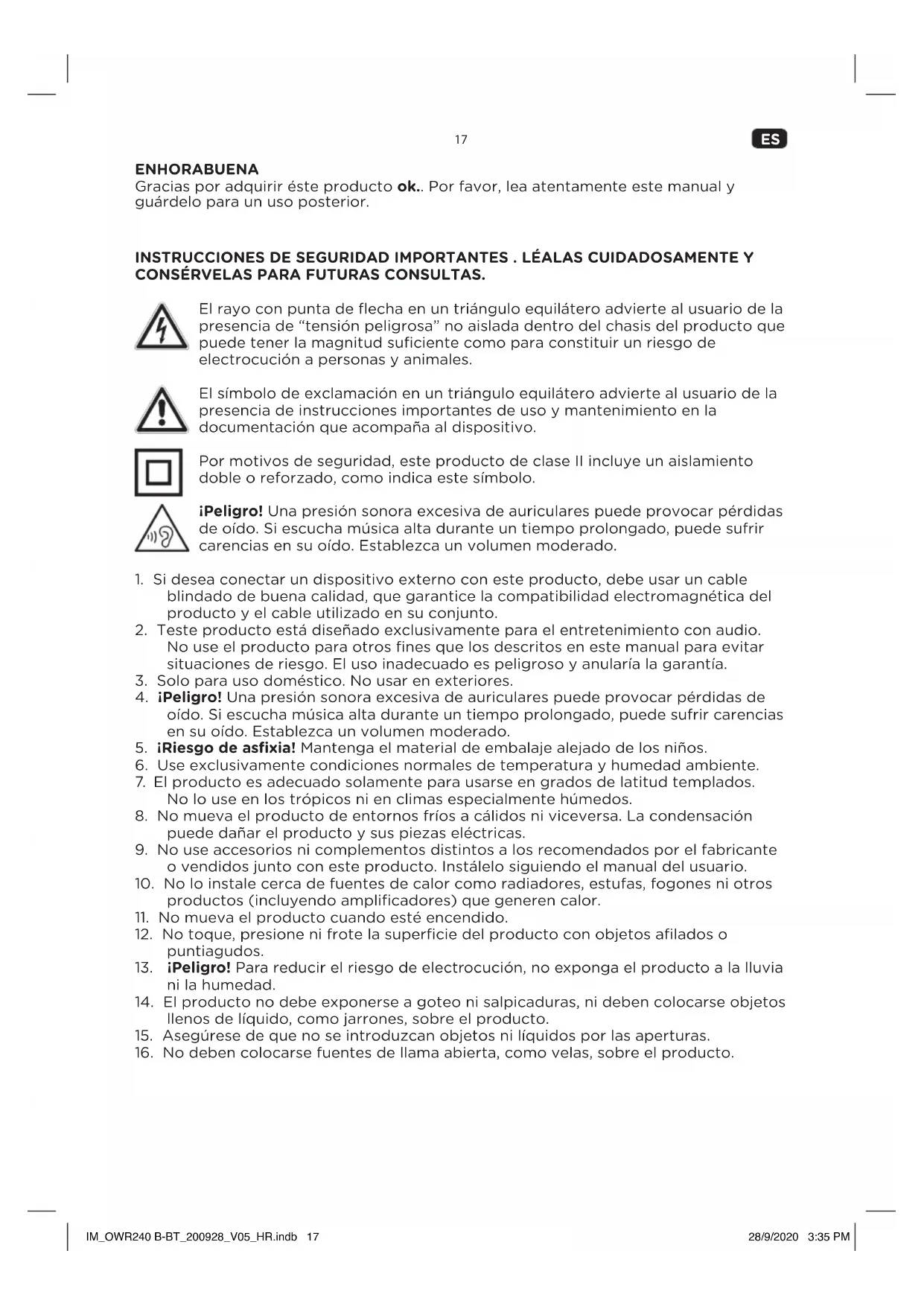 ENHORABUENA Gracias por adquirir éste producto ok.. Por favor, lea atentamente este manual y guárdelo para un uso posterior. INSTRUCCIONES DE SEGURIDAD IMPORTANTES . LÉALAS CUIDADOSAMENTE Y CONSÉRVELAS PARA FUTURAS CONSULTAS. El rayo con punta de flecha en un triángulo equilátero advierte al usuario de la presencia de “tensión peligrosa” no aislada dentro del chasis del producto que puede tener la magnitud suficiente como para constituir un riesgo de electrocución a personas y animales. El símbolo de exclamación en un triángulo equilátero advierte al usuario de la presencia de instrucciones importantes de uso y mantenimiento en la documentación que acompaña al dispositivo. Por motivos de seguridad, este producto de clase II incluye un aislamiento doble o reforzado, como indica este símbolo. ¡Peligro! Una presión sonora excesiva de auriculares puede provocar pérdidas de oído. Si escucha música alta durante un tiempo prolongado, puede sufrir carencias en su oído. Establezca un volumen moderado.