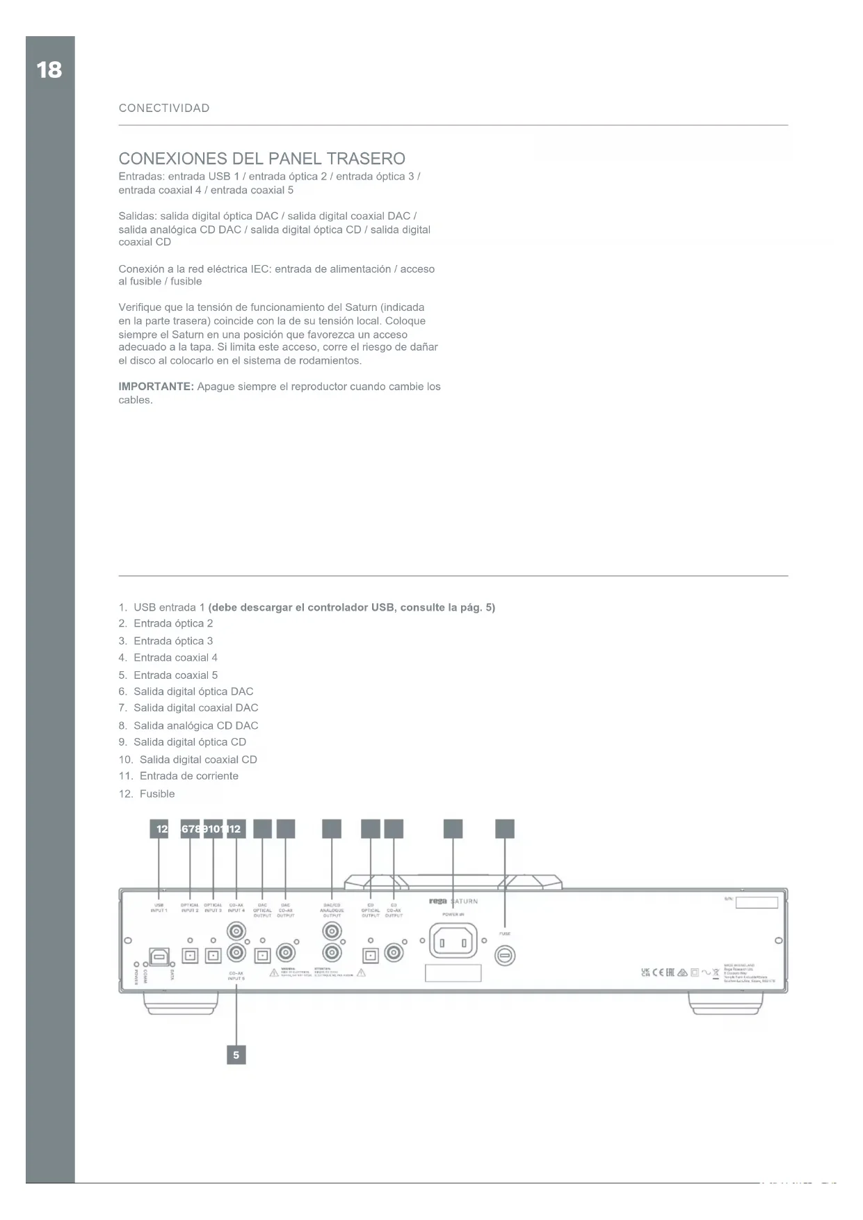 Entradas: entrada USB 1 / entrada óptica 2 / entrada óptica 3 / entrada coaxial 4 / entrada coaxial 5 Salidas: salida digital óptica DAC / salida digital coaxial DAC / salida analógica CD DAC / salida digital óptica CD / salida digital coaxial CD Conexión a la red eléctrica IEC: entrada de alimentación / acceso al fusible / fusible Verique que la tensión de funcionamiento del Saturn (indicada en la parte trasera) coincide con la de su tensión local. Coloque siempre el Saturn en una posición que favorezca un acceso adecuado a la tapa. Si limita este acceso, corre el riesgo de dañar el disco al colocarlo en el sistema de rodamientos. IMPORTANTE: Apague siempre el reproductor cuando cambie los cables.