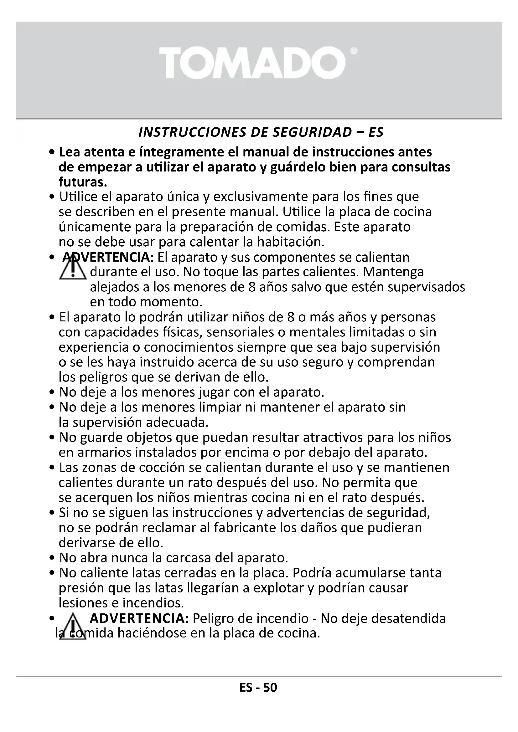- ADVERTENCIA: Peligro de incendio - No deje desatendida la comida haciéndose en la placa de cocina.