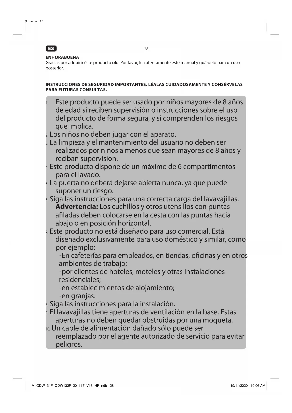 - Evite dosicar en exceso. Precaución: Una dosicación incorrecta de detergente, sal y otros aditivos pueden dañar el producto y afectar a su correcto funcionamiento. IM_ODW131F_ODW132F_201117_V13_HR.indb 35IM_ODW131F_ODW132F_201117_V13_HR.indb 35 19/11/2020 10:06 AM19/11/2020 10:06 AM36 Size = A5