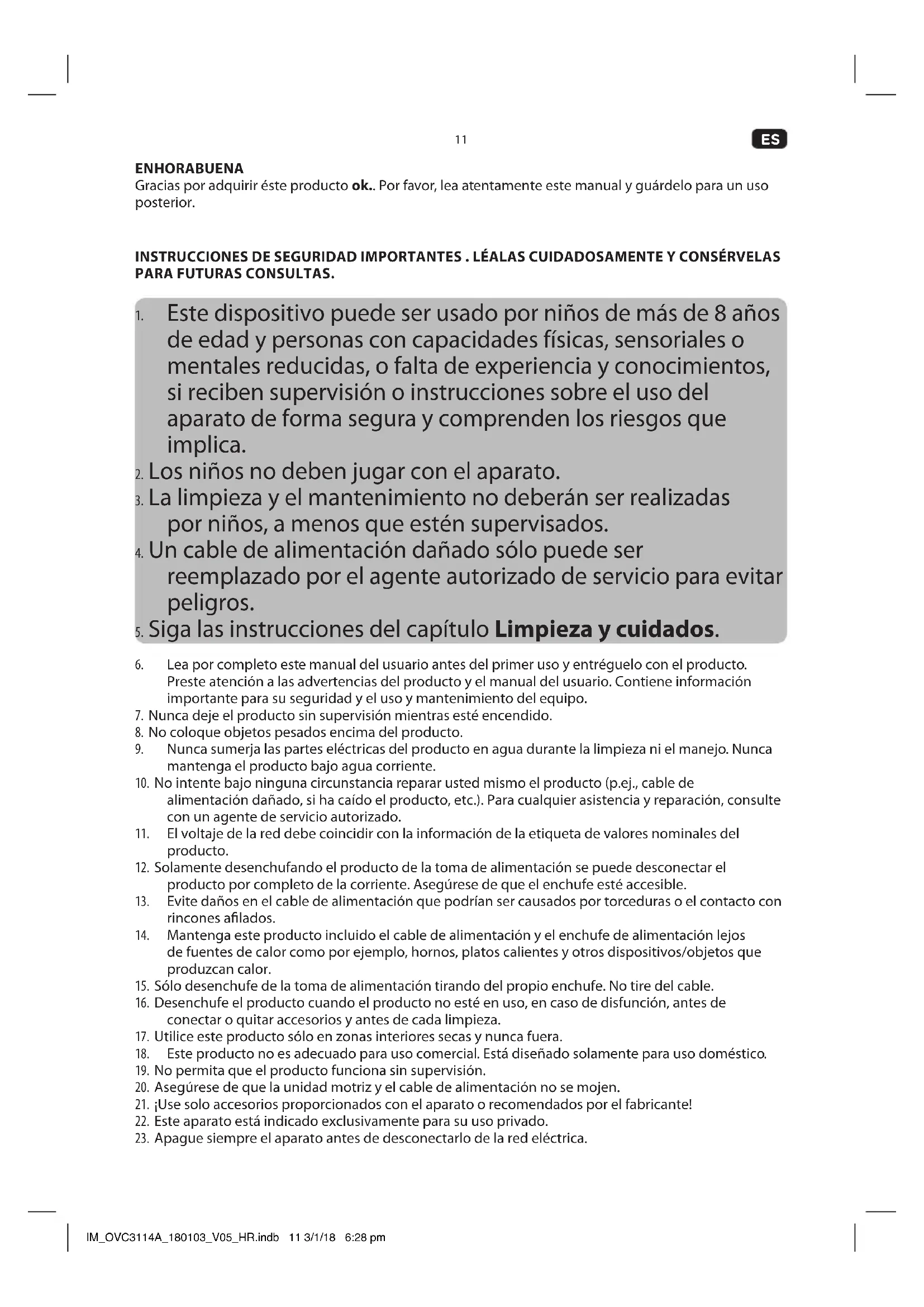 - Por favor, consulte el sitio web de abajo para obtener información técnica detallada o contacte con el fabricante para que le proporcione el documento técnico: www.ok-online.com ELIMINACIÓN No deseche este aparato en la basura doméstica. Llévelo a un punto de recogida selectiva para el reciclaje de los componentes eléctricos y electrónicos. Póngase en contacto con su vendedor o autoridades locales para obtener más información al respecto. IM_OVC3114A_180103_V05_HR.indb 14 3/1/18 6:28 pm15
