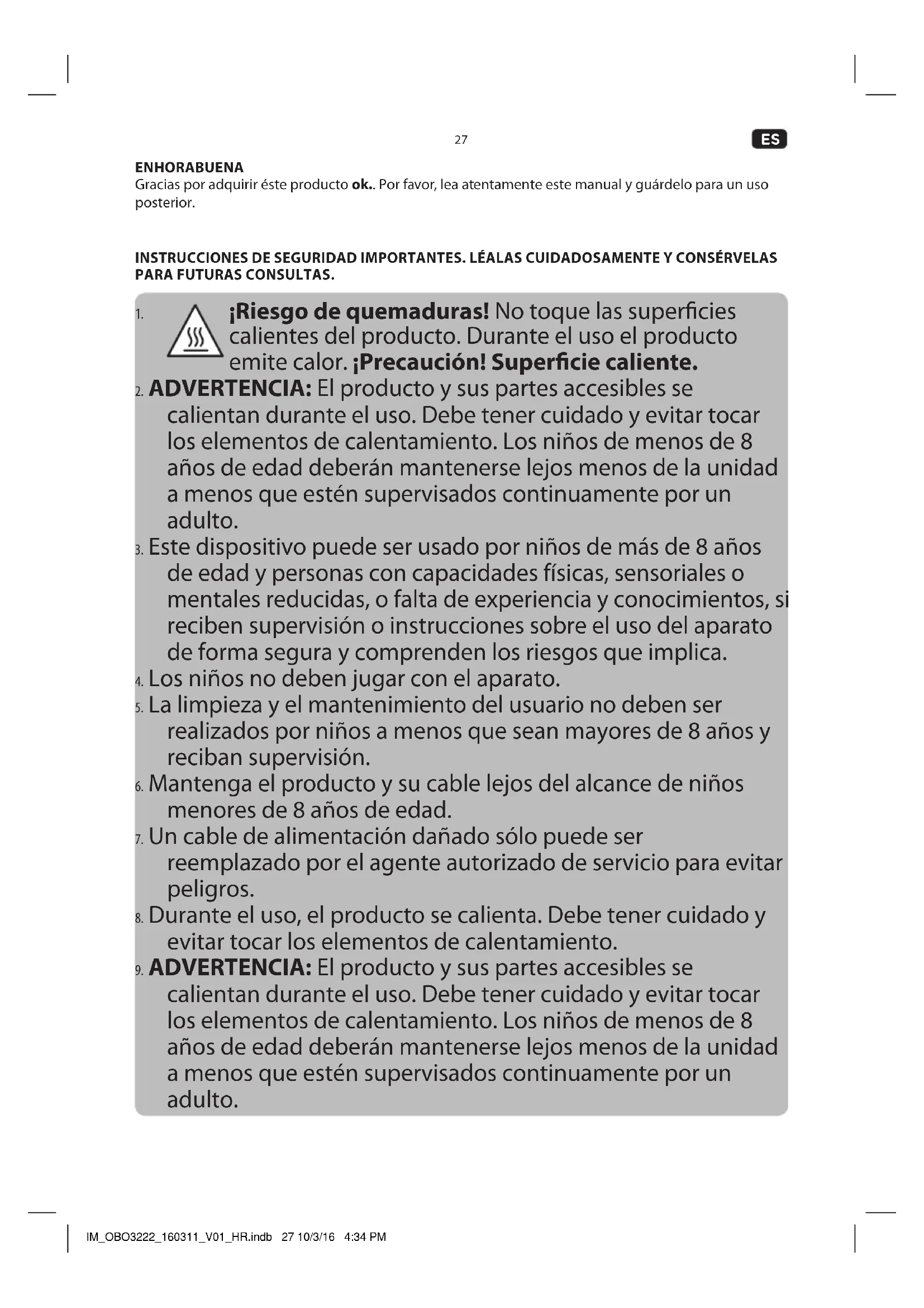 calientan durante el uso. Debe tener cuidado y evitar tocar los elementos de calentamiento. Los niños de menos de 8 años de edad deberán mantenerse lejos menos de la unidad a menos que estén supervisados continuamente por un adulto. IM_OBO3222_160311_V01_HR.indb 27 10/3/16 4:34 PM28