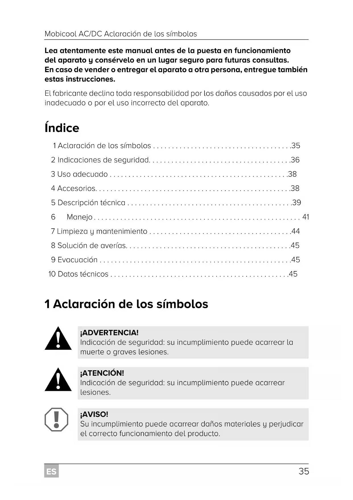 ¡ADVERTENCIA! Indicación de seguridad: su incumplimiento puede acarrear la muerte o graves lesiones. ¡ATENCIÓN! Indicación de seguridad: su incumplimiento puede acarrear lesiones. ¡AVISO! Su incumplimiento puede acarrear daños materiales y perjudicar el correcto funcionamiento del producto. Mobicool-AC-DC--O-16s.book Seite 35 Montag, 8. Januar 2018 6:11 18ES Indicaciones de seguridad Mobicool AC/DC