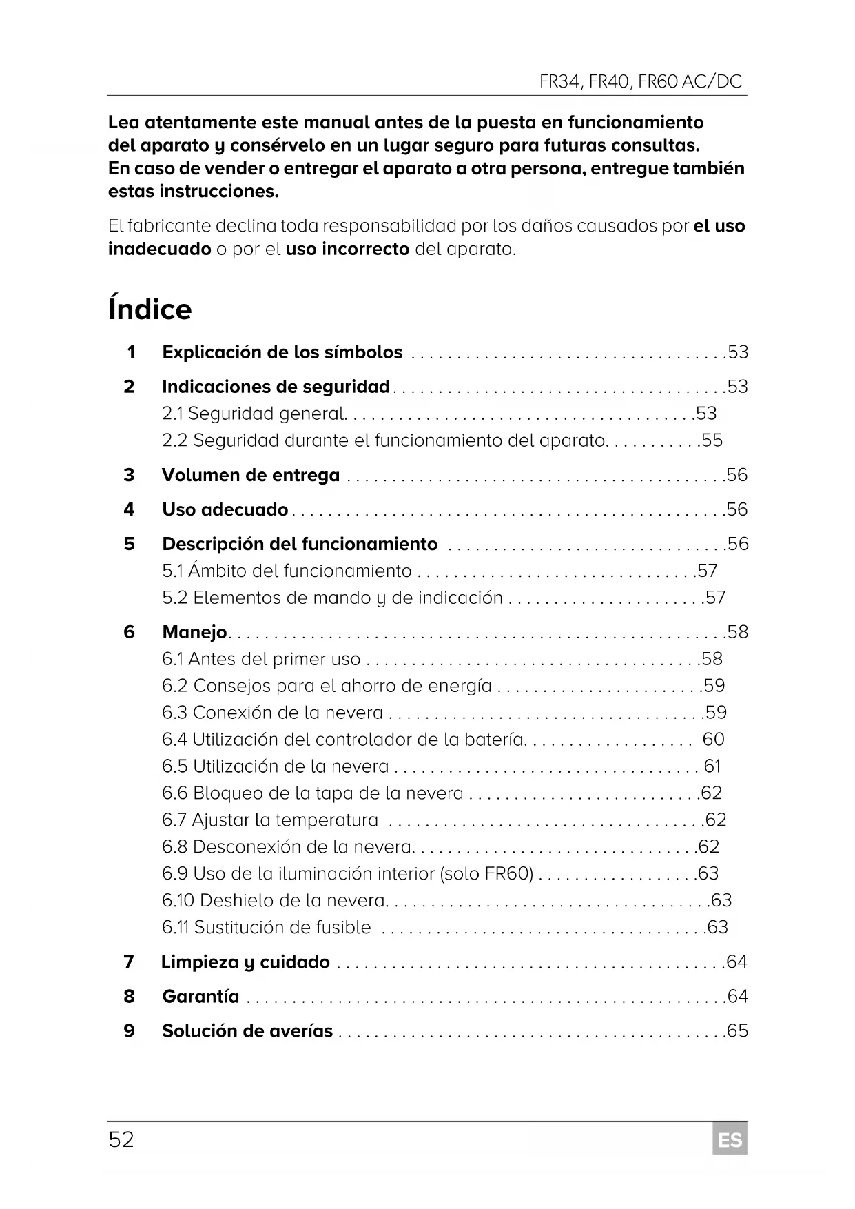 ¡AVISO! No utilice ningún aparato eléctrico dentro de la nevera, a no ser que el aparato en cuestión haya sido recomendado para ello por el fabricante. No coloque el aparato cerca de llamas vivas ni de otras fuentes de calor (calefacción, radiación directa del sol, estufas de gas, etc.). ¡Peligro de sobrecalentamiento! Asegúrese todo el tiempo de que el calor producido durante el funcionamiento se puede desalojar adecuadamente. Asegúrese de que el aparato guarda la suficiente distancia con las paredes u objetos, de forma que el aire pueda circular. Procure que no se obstruyan las ranuras de ventilación. No introduzca líquidos ni hielo en el contenedor interior. No sumerja nunca el aparato en agua. Proteja el aparato y los cables del calor y de la humedad. FR34-FR40-FR60--O-16s.book Seite 55 Donnerstag, 19. Juli 2018 3:22 15ES Volumen de entrega FR34, FR40, FR60 AC/DC