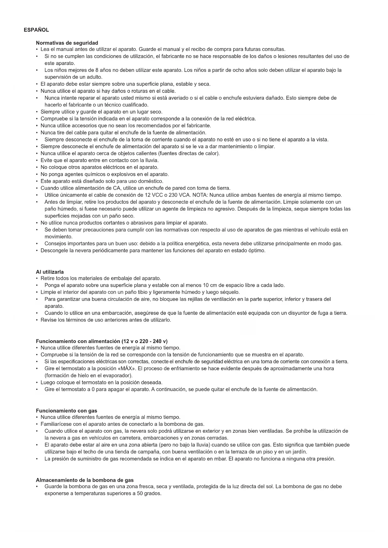- Cuando utilice el aparato con gas, la nevera solo podrá utilizarse en exterior y en zonas bien ventiladas. Se prohíbe la utilización de la nevera a gas en vehículos en carretera, embarcaciones y en zonas cerradas.