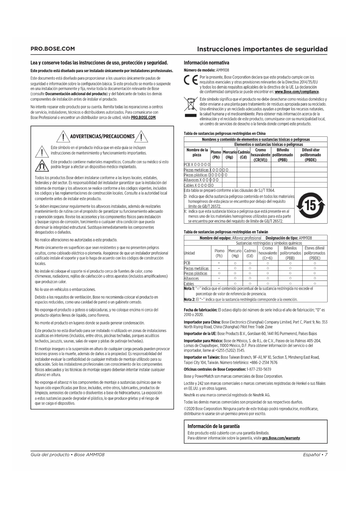 Para Obtener información sobre la garantía, visite pro.Bose.com/warranty.