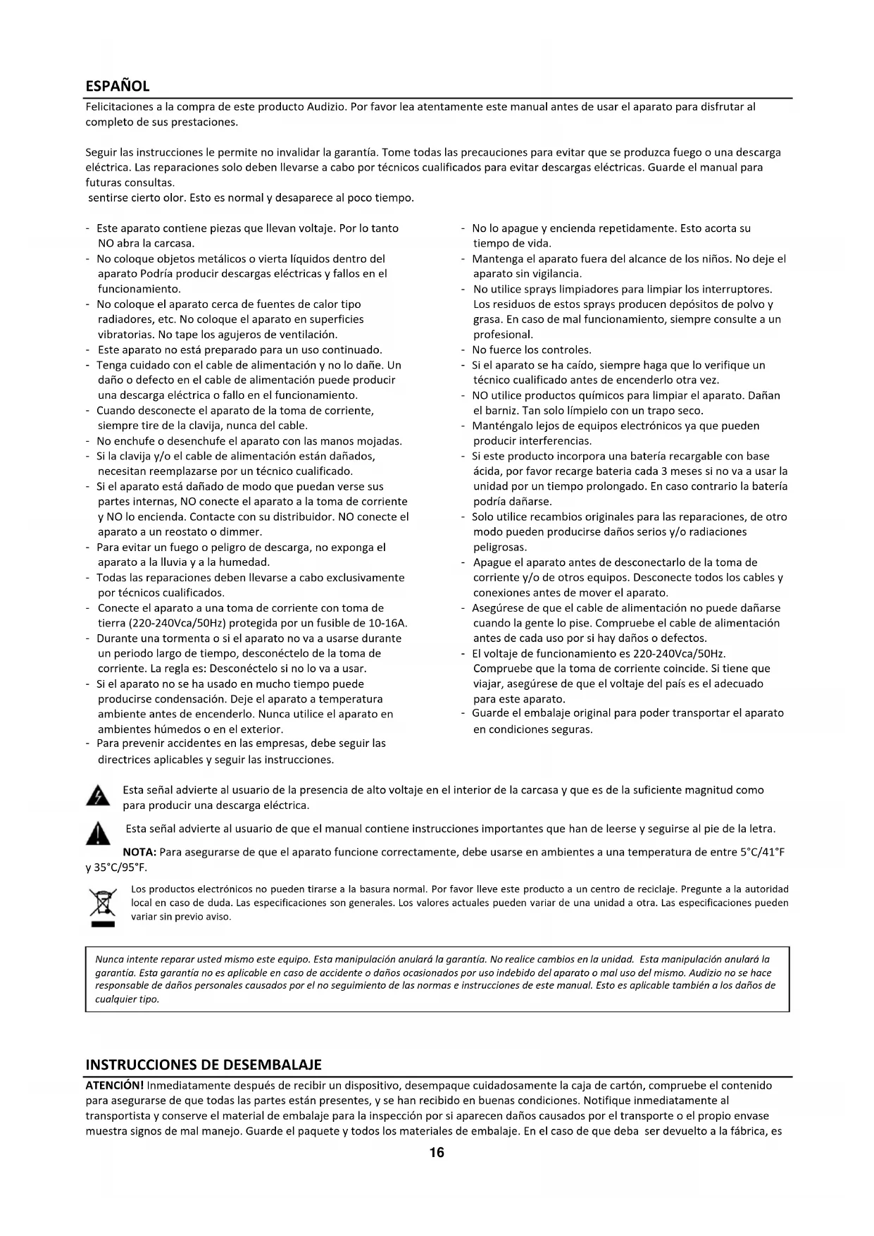 ATENCIÓN! Inmediatamente después de recibir un dispositivo, desempaque cuidadosamente la caja de cartón, compruebe el contenido para asegurarse de que todas las partes están presentes, y se han recibido en buenas condiciones. Notifique inmediatamente al transportista y conserve el material de embalaje para la inspección por si aparecen daños causados por el transporte o el propio envase muestra signos de mal manejo. Guarde el paquete y todos los materiales de embalaje. En el caso de que deba ser devuelto a la fábrica, es Nunca intente reparar usted mismo este equipo. Esta manipulación anulará la garantía. No realice cambios en la unidad. Esta manipulación anulará la garantía. Esta garantía no es aplicable en caso de accidente o daños ocasionados por uso indebido del aparato o mal uso del mismo. Audizio no se hace responsable de daños personales causados por el no seguimiento de las normas e instrucciones de este manual. Esto es aplicable también a los daños de cualquier tipo.17 importante que el aparato sea devuelto en la caja de la fábrica y embalaje originales. Si el aparato ha estado expuesto a grandes cambios de temperatura (tras el transporte), no lo enchufe inmediatamente. La condensación de agua producida podría dañar su aparato. Deje el dispositivo apagado hasta que se haya alcanzado la temperatura ambiente.