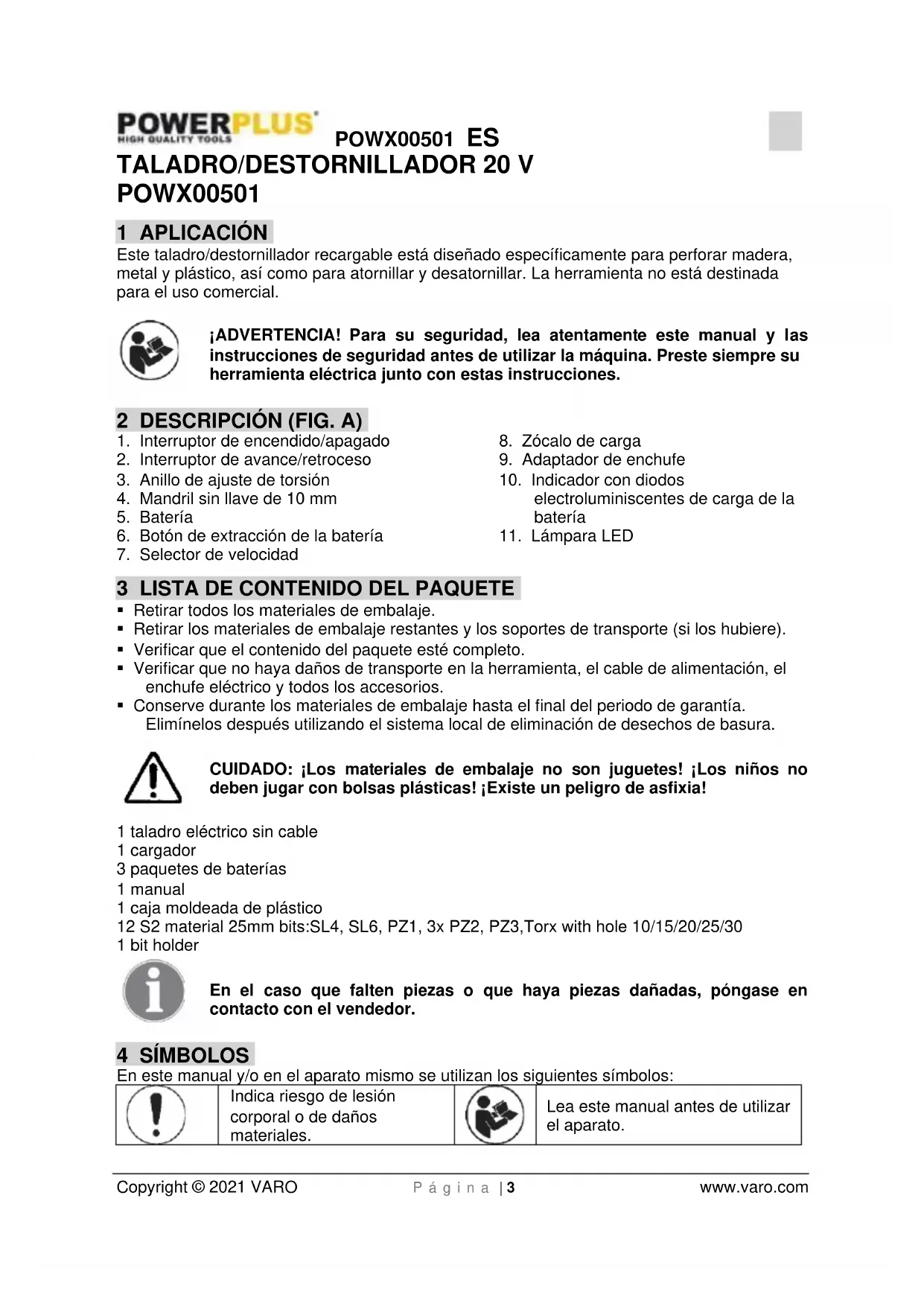 VARO N.V. – Vic. Van Rompuy N.V. Joseph Van Instraat 9. BE2500 Lier – Bélgica, declara que: Tipo de aparato: Taladro/Destornillador Marca: POWERplus Número del producto: POWX00501 está en conformidad con los requisitos esenciales y otras disposiciones pertinentes de las Directivas europeas aplicables, basados en la aplicación de las normas europeas armonizadas. Cualquier modificación no autorizada de este aparato anula esta declaración. Directivas europeas (incluyendo, si se aplica, sus respectivas enmiendas hasta la fecha de la firma): 2011/65/EU 2006/42/EC 2014/30/EU Normas europeas armonizadas (incluyendo, si se aplica, sus respectivas hasta la fecha de la firma): EN60745-1: 2009 EN60745-2-1: 2010 EN55014-1: 2017 EN55014-2 : 2015 Custodio de la documentación técnica: Philippe Vankerkhove, VARO – Vic. Van Rompuy N.V. El suscrito actúa en nombre del director general de la compañía, Ludo Mertens Certification Manager 11/02/2021, Lier - BelgiumPOWX00501 IT Copyright © 2021 VARO Pag. | 1 www.varo.com 1 APPLICAZIONE .............................................................................. 3