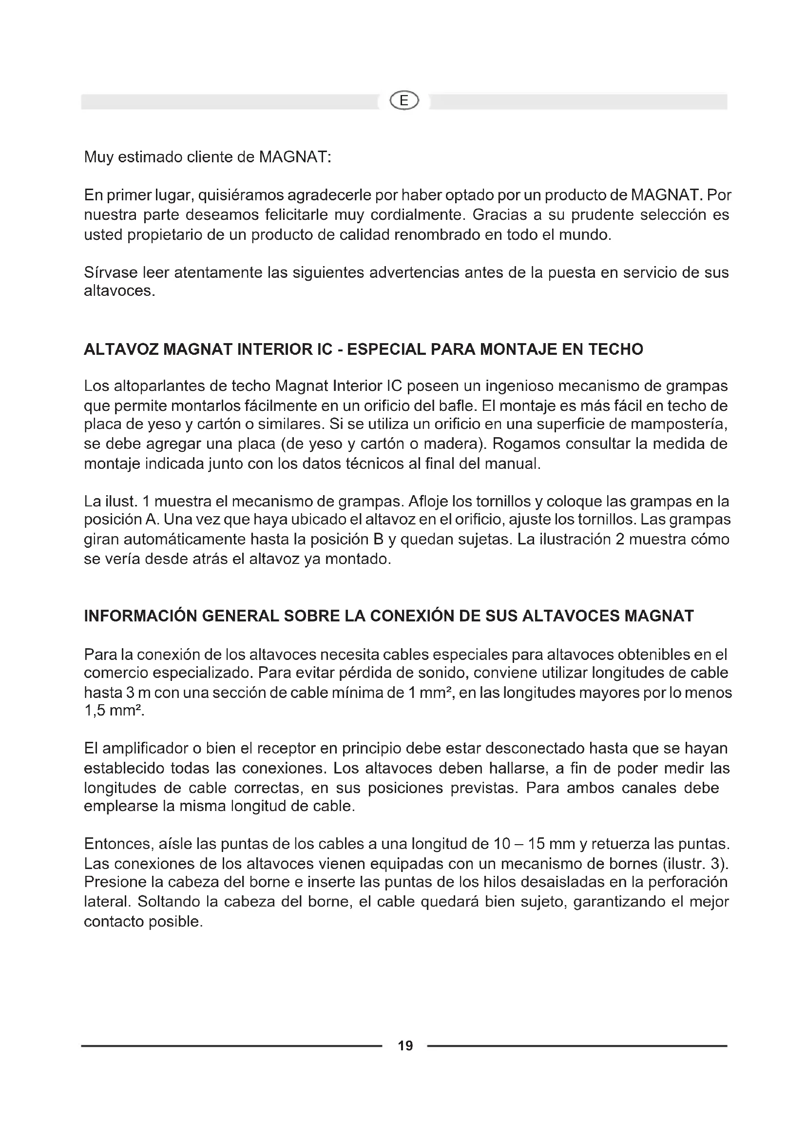 Muy estimado cliente de MAGNAT: En primer lugar, quisiéramos agradecerle por haber optado por un producto de MAGNAT. Por nuestra parte deseamos felicitarle muy cordialmente. Gracias a su prudente selección es usted propietario de un producto de calidad renombrado en todo el mundo. Sírvase leer atentamente las siguientes advertencias antes de la puesta en servicio de sus altavoces. ALTAVOZ MAGNAT INTERIOR IC - ESPECIAL PARA MONTAJE EN TECHO Los altoparlantes de techo Magnat Interior IC poseen un ingenioso mecanismo de grampas que permite montarlos fácilmente en un orificio del bafle. El montaje es más fácil en techo de placa de yeso y cartón o similares. Si se utiliza un orificio en una superficie de mampostería, se debe agregar una placa (de yeso y cartón o madera). Rogamos consultar la medida de montaje indicada junto con los datos técnicos al final del manual. La ilust. 1 muestra el mecanismo de grampas. Afloje los tornillos y coloque las grampas en la posición A. Una vez que haya ubicado el altavoz en el orificio, ajuste los tornillos. Las grampas giran automáticamente hasta la posición B y quedan sujetas. La ilustración 2 muestra cómo se vería desde atrás el altavoz ya montado. INFORMACIÓN GENERAL SOBRE LA CONEXIÓN DE SUS ALTAVOCES MAGNAT Para la conexión de los altavoces necesita cables especiales para altavoces obtenibles en el comercio especializado. Para evitar pérdida de sonido, conviene utilizar longitudes de cable hasta 3 m con una sección de cable mínima de 1 mm², en las longitudes mayores por lo menos 1,5 mm². El amplificador o bien el receptor en principio debe estar desconectado hasta que se hayan establecido todas las conexiones. Los altavoces deben hallarse, a fin de poder medir las longitudes de cable correctas, en sus posiciones previstas. Para ambos canales debe emplearse la misma longitud de cable. Entonces, aísle las puntas de los cables a una longitud de 10 – 15 mm y retuerza las puntas. Las conexiones de los altavoces vienen equipadas con un mecanismo de bornes (ilustr. 3). Presione la cabeza del borne e inserte las puntas de los hilos desaisladas en la perforación lateral. Soltando la cabeza del borne, el cable quedará bien sujeto, garantizando el mejor contacto posible.20