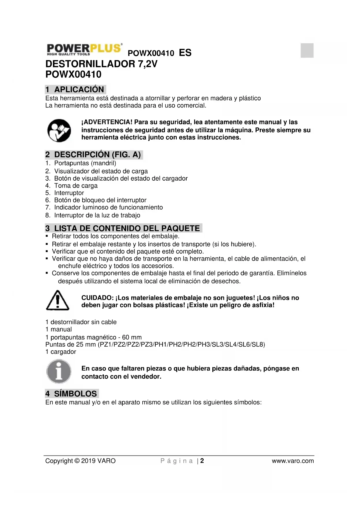 - Conserve los componentes de embalaje hasta el final del periodo de garantía. Elimínelos después utilizando el sistema local de eliminación de desechos. CUIDADO: ¡Los materiales de embalaje no son juguetes! ¡Los niños no deben jugar con bolsas plásticas! ¡Existe un peligro de asfixia! 1 destornillador sin cable 1 manual 1 portapuntas magnético - 60 mm Puntas de 25 mm (PZ1/PZ2/PZ2/PZ3/PH1/PH2/PH2/PH3/SL3/SL4/SL6/SL8) 1 cargador En caso que faltaren piezas o que hubiera piezas dañadas, póngase en contacto con el vendedor. 4 SÍMBOLOS En este manual y/o en el aparato mismo se utilizan los siguientes símbolos:POWX00410 ES Copyright © 2019 VARO P á g i n a | 3 www.varo.com