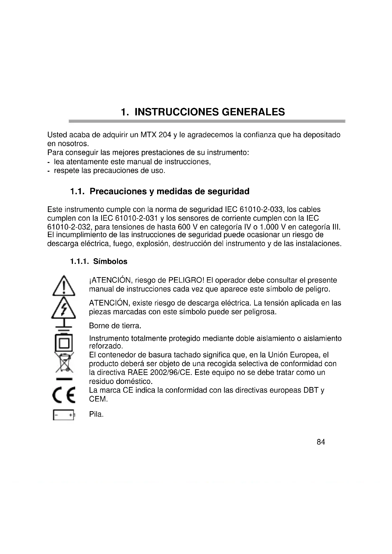 Usted acaba de adquirir un MTX 204 y le agradecemos la confianza que ha depositado en nosotros. Para conseguir las mejores prestaciones de su instrumento: - lea atentamente este manual de instrucciones, - respete las precauciones de uso. 1.1. Precauciones y medidas de seguridad Este instrumento cumple con la norma de seguridad IEC 61010-2-033, los cables cumplen con la IEC 61010-2-031 y los sensores de corriente cumplen con la IEC 61010-2-032, para tensiones de hasta 600 V en categoría IV o 1.000 V en categoría III. El incumplimiento de las instrucciones de seguridad puede ocasionar un riesgo de descarga eléctrica, fuego, explosión, destrucción del instrumento y de las instalaciones.