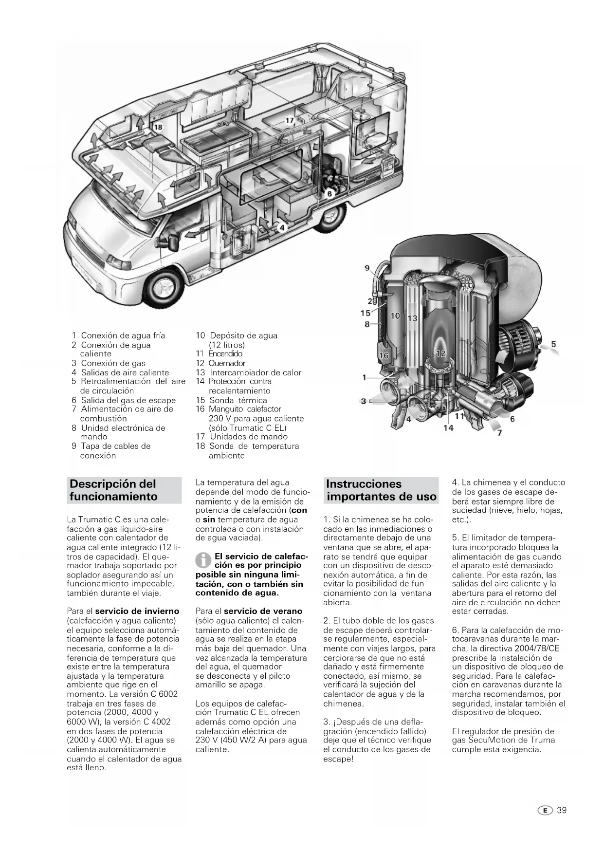 garantiekrav Producentens adresse: Truma Gerätetechnik GmbH & Co. KG, Wernher-von-Braun-Straße 12, 85640 Putzbrunn. I tilfælde af fejl skal man i Tyskland principielt kontakte Trumas serviceafdeling. I andre lande kontaktes de pågældende servicepartnere (se Trumas servicehæfte eller på www.truma.com). Garan- tibeviset skal forelægges i korrekt udfyldt stand eller an- læggets fabriksnummer samt købsdato angives. For at producenten kan kon- trollere om der foreligger et garantitilfælde, skal slutbru- geren transportere eller sen- de anlægget til producenten for egen risiko. Ved skade på varmelegemer (varmeveks- lere) skal gastrykregulatoren medsendes. Ved indsendelse til fabrikken skal forsendelsen foretages pr. fragtpost. I garantitilfælde overtager fabrikken trans- portomkostninger samt om- kostninger i forbindelse med indsendelse og tilbagesen- delse. Hvis der ikke er tale om en garantisag, giver pro- ducenten besked til kunden om dette og angiver repara- tionsomkostningerne, som ikke dækkes af producenten. I givet fald påhviler det også kunden at betale forsendel- sesomkostninger. 381 Conexión de agua fría 2 Conexión de agua caliente 3 Conexión de gas 4 Salidas de aire caliente 5 Retroalimentación del aire de circulación 6 Salida del gas de escape 7 Alimentación de aire de combustión 8 Unidad electrónica de mando 9 Tapa de cables de conexión 10 Depósito de agua (12 litros) 11 Encendido 12 Quemador 13 Intercambiador de calor 14 Protección contra recalentamiento 15 Sonda térmica 16 Manguito calefactor 230 V para agua caliente (sólo Trumatic C EL) 17 Unidades de mando 18 Sonda de temperatura ambiente Descripción del funcionamiento La Trumatic C es una cale- facción a gas líquido-aire caliente con calentador de agua caliente integrado (12 li- tros de capacidad). El que- mador trabaja soportado por soplador asegurando así un funcionamiento impecable, también durante el viaje. Para el servicio de invierno (calefacción y agua caliente) el equipo selecciona automá- ticamente la fase de potencia necesaria, conforme a la di- ferencia de temperatura que existe entre la temperatura ajustada y la temperatura ambiente que rige en el momento. La versión C 6002 trabaja en tres fases de potencia (2000, 4000 y 6000 W), la versión C 4002 en dos fases de potencia (2000 y 4000 W). El agua se calienta automáticamente cuando el calentador de agua está lleno. La temperatura del agua depende del modo de funcio- namiento y de la emisión de potencia de calefacción (con o sin temperatura de agua controlada o con instalación de agua vaciada). El servicio de calefac- ción es por principio posible sin ninguna limi- tación, con o también sin contenido de agua. Para el servicio de verano (sólo agua caliente) el calen- tamiento del contenido de agua se realiza en la etapa más baja del quemador. Una vez alcanzada la temperatura del agua, el quemador se desconecta y el piloto amarillo se apaga. Los equipos de calefac- ción Trumatic C EL ofrecen además como opción una calefacción eléctrica de 230 V (450 W/2 A) para agua caliente. Instrucciones importantes de uso