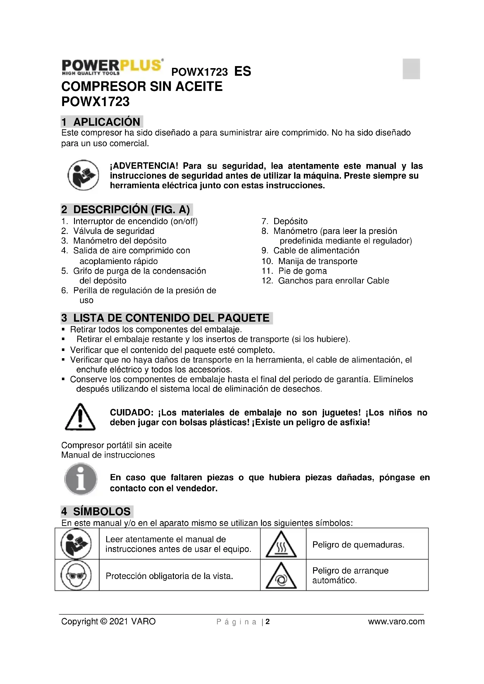 Este símbolo indica las advertencias que se deben leer atentamente antes de utilizar el producto, para evitar posibles daños físicos al usuario. El aire comprimido es una forma de energía potencialmente peligrosa, por lo tanto es necesario prestar una gran atención cuando se utilizan el esor y los accesorios.POWX1723 ES Copyright © 2021 VARO P á g i n a | 5 www.varo.com Atención: el compresor podría arrancar al improviso en caso de corte de luz y posterior restablecimiento de la corriente eléctrica. El valor de PRESIÓN ACÚSTICA medido de 4 m. equivale al valor de POTENCIA ACÚSTICA indicado en la etiqueta amarilla, colocada en el compresor, menos 20 dB.