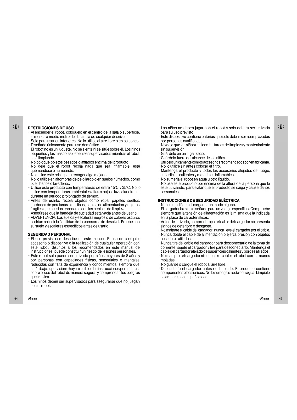 IMPORTANTE Lea todas las instrucciones antes de usarlo. Conserve las instrucciones para futuras consultas. ADVERTENCIA Utilice el robot solo como se describe en este manual. El incumplimiento de las instrucciones señaladas puede causar descargas eléctricas, incendios y/o lesiones graves. Al usar cualquier robot eléctrico, se deberán cumplir siempre las precauciones de seguridad básicas, incluidas las siguientes, a fin de reducir el riesgo de incendio, descargas eléctricas, fugas en las baterías o lesiones personales. Gracias por escoger el nuevo robot aspirador Vileda VR 201 PetPro. El VR 201 PetPro se con- vertirá en su compañero de confianza para la limpieza diaria, ayudándole a eliminar la sucie- dad y el polvo sin realizar ningún tipo de esfuerzo. ÍNDICE 1. ADVERTENCIAS GENERALES 432. SABER MÁS DE VR 201 PETPRO 473. CARGA Y RECARGA DE LA BATERÍA 484. MANTENIMIENTO 495. SOLUCIÓN DE PROBLEMAS 506. MEDIO AMBIENTE Y RECICLAJE DEL PRODUCTO 517. ESPECIFICACIONES TÉCNICAS DEL PRODUCTO 518. GARANTÍA DEL PRODUCTO VILEDA 5144
