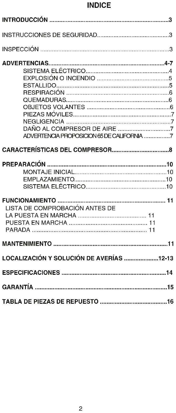 Si no se conecta a tierra correctamente el compresor de aire, podrían ocurrir lesiones graves o la muerte. Su compresor de aire es alimentado por electricidad y puede causar electrochoque o electrocución si no se usa debidamente. El cordón eléctrico puede causar electrochoque. Puede ocurrir electrochoque si no se maneja correctamente el compresor de aire. Pueden ocurrir lesiones graves o la muerte si personas sin experiencia intentan hacer las reparaciones eléctricas. Asegúrese de que el compresor de aire está enchufado a un tomacorriente correctamente conectado a tierra y que suministra el voltaje correcto y la protección adecuada mediante fusibles. Revise el cordón de alimentación para ver si hay indicios de aplastamiento, cortes o daños por calor. Reemplace el cordón defectuoso antes de usar el compresor. Mantenga todas las conexiones secas y elevadas del suelo. No deje que los cordones eléctricos queden en el agua o en una posición donde pudieran quedar en contacto con agua. No toque el enchufe con las manos mojadas. No tire del cordón eléctrico para desenchufarlo del tomacorriente. No maneje nunca el compresor de aire en condiciones mojadas o a la intemperie cuando está lloviendo. No maneje nunca el compresor de aire con los protectores o cubiertas fuera de lugar o dañados. Toda conexión de cableado o reparación eléctrica en este compresor de aire debe ser ejecutada por personal de servicio autorizado y de acuerdo con los códigos eléctricos nacionales y locales. Antes de abrir un caja de conexiones eléctricas, apague siempre el compresor de aire, descargue la presión y desenchufe el compresor de la fuente de alimentación. Deje que el compresor de aire se enfríe. Nunca dé por supuesto que puede trabajar sin peligro en el compresor de aire, simplemente por que no está funcionando. ¡Podría arrancar en cualquier momento!5