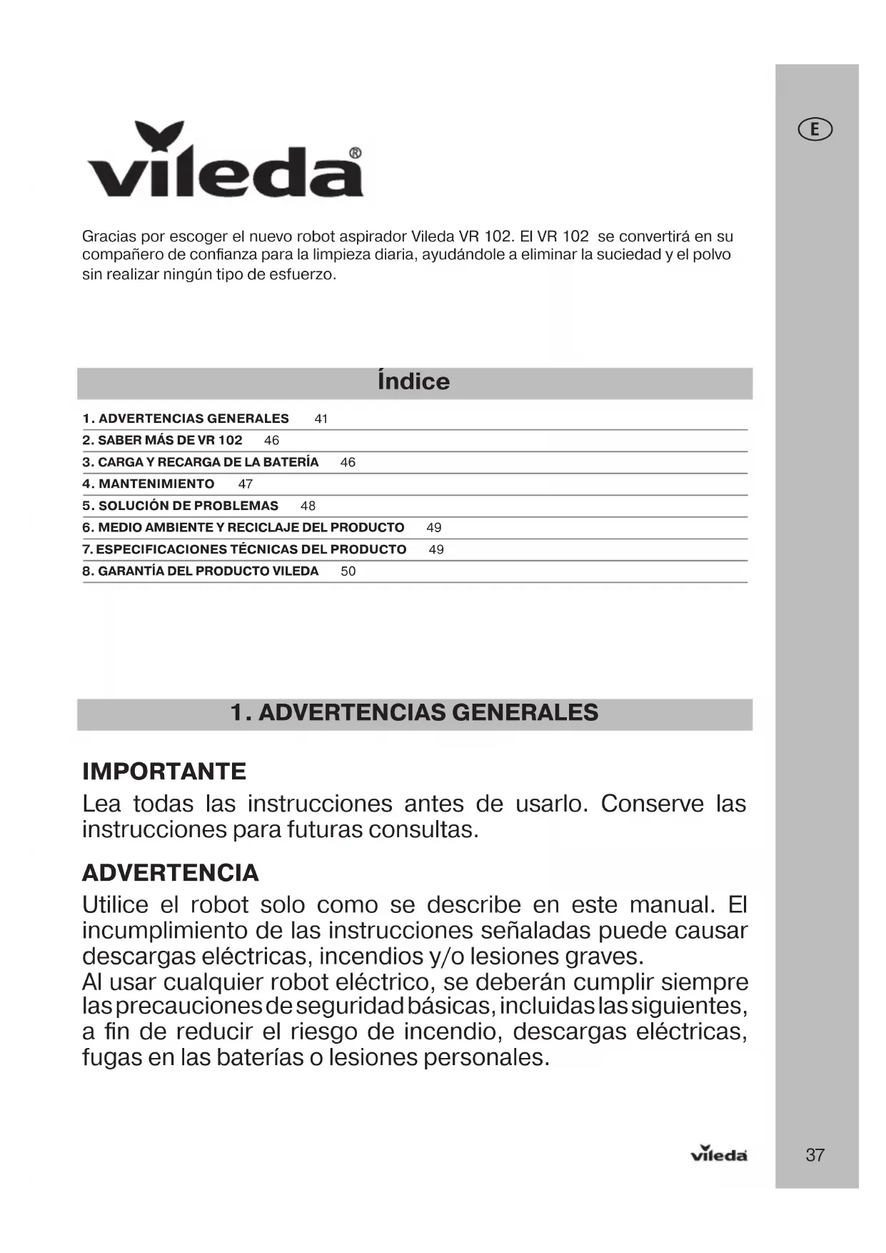 IMPORTANTE Lea todas las instrucciones antes de usarlo. Conserve las instrucciones para futuras consultas. ADVERTENCIA Utilice el robot solo como se describe en este manual. El incumplimiento de las instrucciones señaladas puede causar descargas eléctricas, incendios y/o lesiones graves. Al usar cualquier robot eléctrico, se deberán cumplir siempre las precauciones de seguridad básicas, incluidas las siguientes, a fin de reducir el riesgo de incendio, descargas eléctricas, fugas en las baterías o lesiones personales. Gracias por escoger el nuevo robot aspirador Vileda VR 102. El VR 102 se convertirá en su compañero de confianza para la limpieza diaria, ayudándole a eliminar la suciedad y el polvo sin realizar ningún tipo de esfuerzo. Índice 1. ADVERTENCIAS GENERALES 412. SABER MÁS DE VR 102 463. CARGA Y RECARGA DE LA BATERÍA 464. MANTENIMIENTO 475. SOLUCIÓN DE PROBLEMAS 486. MEDIO AMBIENTE Y RECICLAJE DEL PRODUCTO 497. ESPECIFICACIONES TÉCNICAS DEL PRODUCTO 498. GARANTÍA DEL PRODUCTO VILEDA 5038