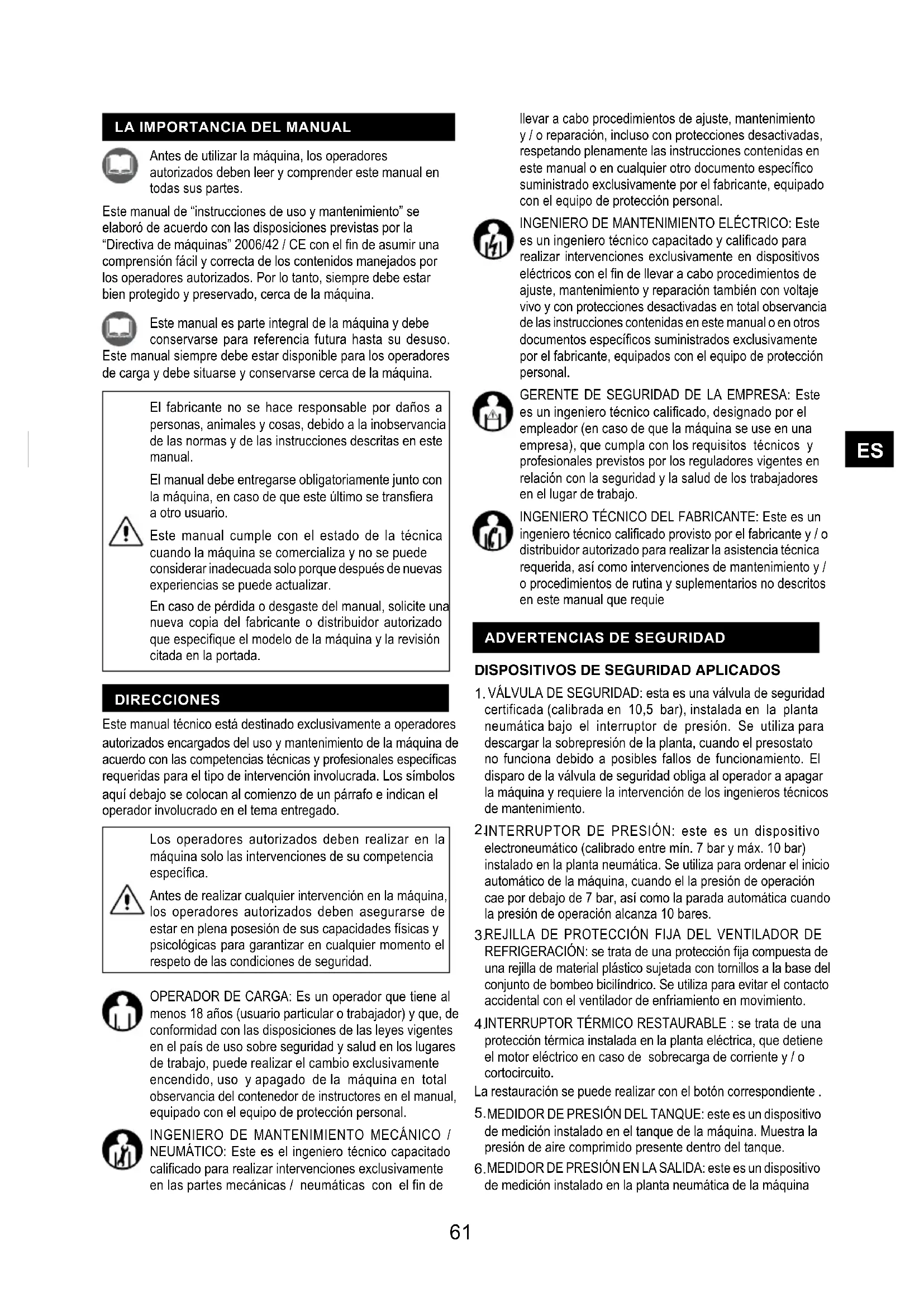 NEUMÁTICO: Este es el ingeniero técnico capacitado calicado para realizar intervenciones exclusivamente en las partes mecánicas / neumáticas con el n de Este manual técnico está destinado exclusivamente a operadores autorizados encargados del uso y mantenimiento de la máquina de acuerdo con las competencias técnicas y profesionales especícas requeridas para el tipo de intervención involucrada. Los símbolos aquí debajo se colocan al comienzo de un párrafo e indican el operador involucrado en el tema entregado. Este manual es parte integral de la máquina y debe conservarse para referencia futura hasta su desuso. Este manual siempre debe estar disponible para los operadores de carga y debe situarse y conservarse cerca de la máquina. Antes de utilizar la máquina, los operadores autorizados deben leer y comprender este manual en todas sus partes. Este manual de “instrucciones de uso y mantenimiento” se elaboró de acuerdo con las disposiciones previstas por la “Directiva de máquinas” 2006/42 / CE con el n de asumir una comprensión fácil y correcta de los contenidos manejados por los operadores autorizados. Por lo tanto, siempre debe estar bien protegido y preservado, cerca de la máquina.