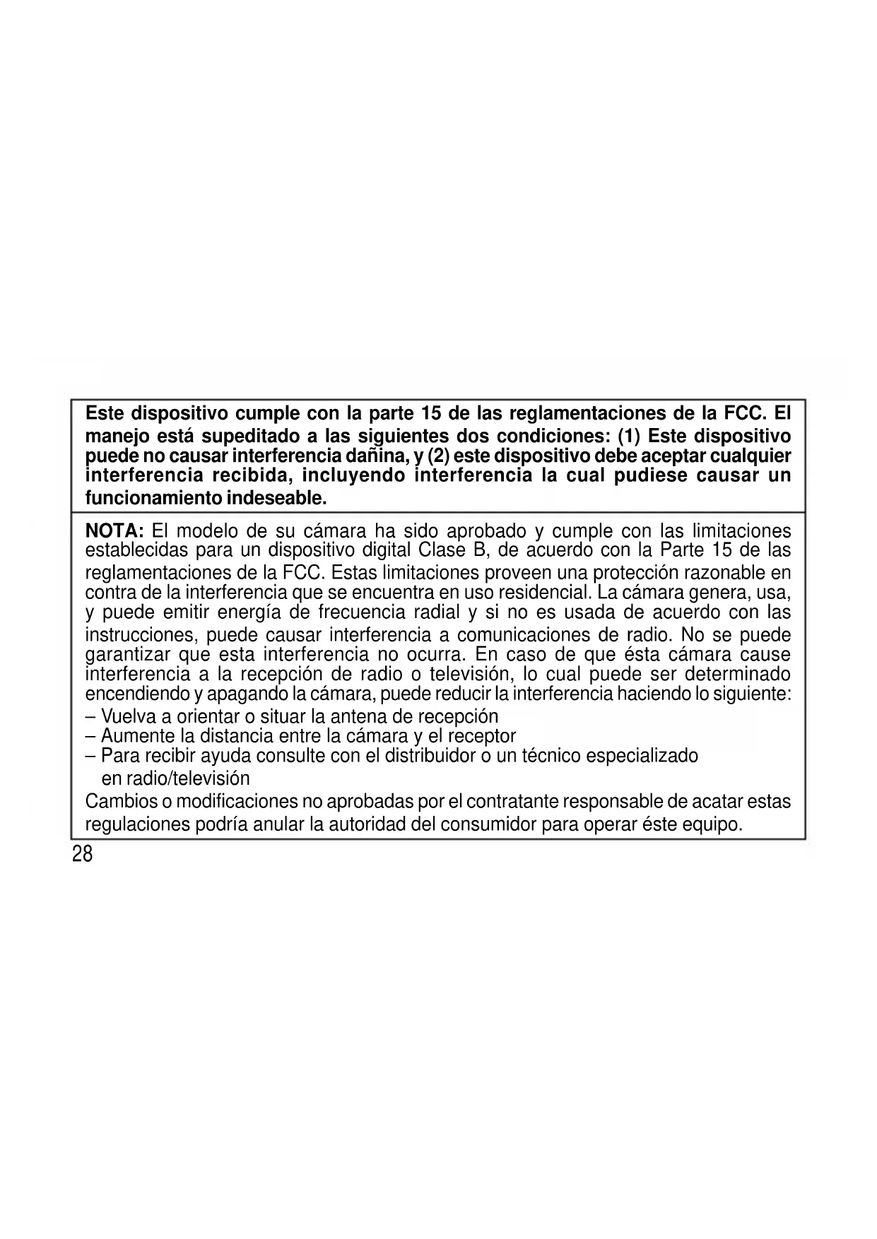 - Remueva las baterías cuando vaya a guardar la cámara por un período de tiempo prolongado. PRECAUCIÓN: Para prevenir la posibilidad de daño y choque eléctrico, no trate, usted mismo, de desarmar o reparar la cámara o la unidad del flash.