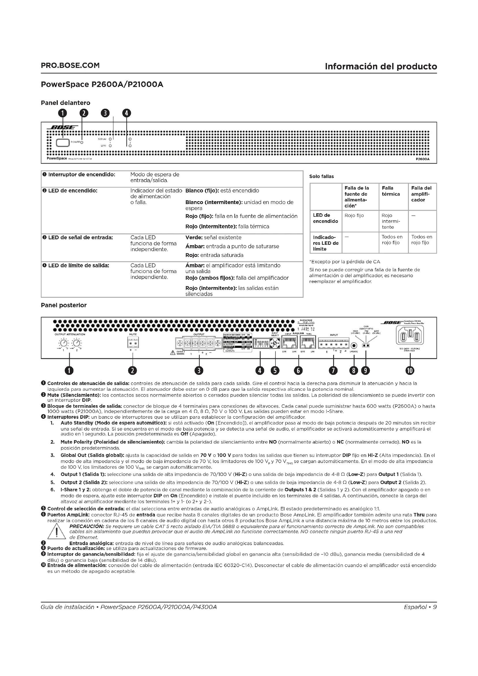 q Controles de atenuación de salida: controles de atenuación de salida para cada salida. Gire el control hacia la derecha para disminuir la atenuación y hacia la izquierda para aumentar la atenuación. El atenuador debe estar en 0 dB para que la salida respectiva alcance la potencia nominal. w Mute (Silenciamiento): los contactos secos normalmente abiertos o cerrados pueden silenciar todas las salidas. La polaridad de silenciamiento se puede invertir con un interruptor DIP. e Bloque de terminales de salida: conector de bloque de 8 terminales para conexiones de altavoces. Cada canal puede proporcionar hasta 300 watts, sin importar la carga en 4 Ω, 8 Ω, 70 V o 100 V. Cada par de salidas puede estar en modo I-Share. r Interruptores DIP: un banco de interruptores que se utilizan para establecer la configuración del amplificador. 1. Auto Standby (Modo de espera automático): si está activado (On [Encendido]), el amplificador pasa al modo de baja potencia después de 20 minutos sin recibir una señal de entrada. Si se encuentra en el modo de baja potencia y se detecta una señal de audio, el amplificador se activará automáticamente y amplificará el audio en 1segundo. La posición predeterminada es O (Apagado). 2. Mute Polarity (Polaridad de silenciamiento): cambie la polaridad de silenciamiento entre NO (normalmente abierto) y NC (normalmente cerrado). NO es la posición predeterminada. 3. Global Out (Salida global): ajusta la capacidad de salida en 70 V o 100 V para todas las salidas que tienen su interruptor DIP fijo en Hi-Z (Alta impedancia). En el modo de alta impedancia y el modo de baja impedancia de 70 V, los limitadores de 100 V y 70 V RMS se cargan automáticamente. En el modo de alta impedancia de 100 V, loslimitadores de 100 V RMS se cargan automáticamente. 4. Output 1 (Salida 1): seleccione una salida de alta impedancia de 70/100 V (Hi-Z) o una salida de baja impedancia de 4-8 Ω (Low-Z) para Output 1 (Salida 1). 5. Output 2 (Salida 2): seleccione una salida de alta impedancia de 70/100 V (Hi-Z) o una salida de baja impedancia de 4-8 Ω (Low-Z) para Output 2 (Salida 2). 6. Output 3 (Salida 3): seleccione una salida de alta impedancia de 70/100 V (Hi-Z) o una salida de baja impedancia de 4-8 Ω (Low-Z) para Output 3 (Salida 3). 7. Output 4 (Salida 4): seleccione una salida de alta impedancia de 70/100 V (Hi-Z) o una salida de baja impedancia de 4-8 Ω (Low-Z) para Output 4 (Salida 4). 8. I-Share 1 y 2: obtenga el doble de potencia de canal mediante la combinación de la corriente de Outputs 1 & 2 (Salidas 1 y 2). 9. I-Share 3 y 4: obtenga el doble de potencia de canal mediante la combinación de la corriente de Outputs 3 & 4 (Salidas 3 y 4). Nota: Con el amplificador apagado o en modo de espera, ajuste uno o ambos interruptores DIP I-Share en On (Encendido) e instale los puentes incluidos en los primeros 4 o en los últimos 4 terminales. A continuación, conecte las cargas de los altavoces al amplificador. Conecte la carga del altavoz I-Share 1 y 2 al amplificador mediante 1+ y 1– (o 2+ y 2–). Conecte la carga del altavoz I-Share 3 y 4 al amplificador mediante los terminales 3+ y 3– (o 4+ y 4–). t Control de selección de entrada: el dial selecciona entre entradas de audio analógicas o AmpLink. El estado predeterminado es analógico 1:1. y Puertos AmpLink: conector RJ-45 de entrada que recibe hasta 8 canales digitales de un producto Bose AmpLink. El amplificador también admite una ruta Thru para realizar laconexión en cadena de los 8 canales de audio digital con hasta otros 8 productos Bose AmpLink a una distancia máxima de 10 metros entre los productos. PRECAUCIÓN: Se requiere un cable CAT 5 recto aislado EIA/TIA 568B o equivalente para el funcionamiento correcto de AmpLink. No son compatibles cables sin aislamiento que pueden provocar que el audio de AmpLink no funcione correctamente. No conecte ningún puerto RJ-45 a una red de Ethernet. u Entrada analógica: entrada de nivel de línea para señales de audio analógicas balanceadas. i Puerto de actualización: se utiliza para actualizaciones de firmware. o Interruptor de ganancia/sensibilidad: fija el ajuste de ganancia/sensibilidad global en ganancia alta (sensibilidad de –10 dBu), ganancia media (sensibilidad de 4 dBu) oganancia baja (sensibilidad de 14 dBu). a Entrada de alimentación: conexión del cable de alimentación (entrada IEC 60320-C14). Desconectar el cable de alimentación cuando el amplificador está encendido es un método de apagado aceptable. q w e r t y u i o a Solo fallasFalla de la fuente de alimenta-ción*Falla térmicaFalla del ampli-ficadorLED de encen- dido Rojo fijo Rojo inter-mitente Indica-dores LED de límite— Todos en rojo fijoCanales 1 y 2 del amplificador A en rojo fijoCanales 3 y 4 del amplificador B en rojo fijo*Excepto por la pérdida de CASi no se puede corregir una falla de la fuente de alimentación o del amplificador, es necesario reemplazar el amplificador.Español • 11Guía de instalación • PowerSpace P2600A/P21000A/P4300A