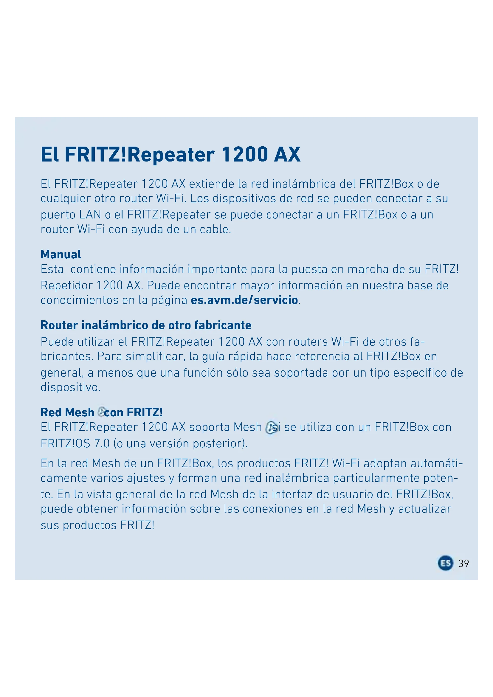 d'adresse d'un navigateur. L'interface utilisateur du FRITZ!Repeater s'ache.38 Volet juridique Déclaration de conformité CE AVM déclare par la présente que le FRITZ!Repeater est conforme aux exigences essentielles et aux instructions pertinentes des directives 2014/53/UE, 2009/125/CE et 2011/65/UE. La version longue de la déclaration de conformité CE est disponible (en anglais) sur en.avm.de/ce. Données de diagnostic An d’améliorer votre produit et d’en assurer le bon fonctionnement sur votre ligne, AVM utilise des rapports d’erreur et, si nécessaire, des données de diagnostic. Vous pouvez modier ces paramètres en cliquant, sous le menu de l'inter- face utilisateur, sur Contenu puis, au bas de la page, sur Services AVM. Gestion des déchets Selon les prescriptions européennes, le FRITZ!Repeater et les câbles ne peuvent être jetés dans les ordures ménagères. Après les avoir utilisés, veuillez les remettre aux services municipaux de gestion des déchets. Mentions légales Les mentions légales et les dispositions de licence sont disponibles dans l'aide sur l’interface utilisateur.39 El FRITZ!Repeater1200AX El FRITZ!Repeater1200AX extiende la red inalámbrica del FRITZ!Box o de cualquier otro router Wi-Fi. Los dispositivos de red se pueden conectar a su puerto LAN o el FRITZ!Repeater se puede conectar a un FRITZ!Box o a un router Wi-Fi con ayuda de un cable. Manual Esta contiene información importante para la puesta en marcha de su FRITZ! Repetidor 1200 AX. Puede encontrar mayor información en nuestra base de conocimientos en la página es.avm.de/servicio. Router inalámbrico de otro fabricante Puede utilizar el FRITZ!Repeater 1200 AX con routers Wi-Fi de otros fa- bricantes. Para simplicar, la guía rápida hace referencia al FRITZ!Box en general, a menos que una función sólo sea soportada por un tipo especíco de dispositivo. Red Mesh con FRITZ! El FRITZ!Repeater1200AX soporta Mesh si se utiliza con un FRITZ!Box con FRITZ!OS7.0 (o una versión posterior). En la red Mesh de un FRITZ!Box, los productos FRITZ! Wi-Fi adoptan automáti- camente varios ajustes y forman una red inalámbrica particularmente poten- te. En la vista general de la red Mesh de la interfaz de usuario del FRITZ!Box, puede obtener información sobre las conexiones en la red Mesh y actualizar sus productos FRITZ!40 Contenido del paquete Nombre Ilustración 1 FRITZ!Repeater1200AX 1 cable LAN 1 guía rápida sin ilustración Seguridad Advertencias de seguridad para el FRITZ!Repeater1200AX Manejo No cubra las ranuras de ventilación. No permita que entren líquidos en el interior. No abrir y no reparar indebidamente. Desconectar de la red eléctrica antes de la limpieza. Limpiar solo con un paño ligeramente húmedo. Ubicación Conectar solo a tomas de corriente de fácil acceso. Ubicar el repetidor en un entorno seco y sin polvo. No utilizar al aire libre.41 Contenido del paquete Nombre Ilustración 1 FRITZ!Repeater1200AX 1 cable LAN 1 guía rápida sin ilustración Seguridad Advertencias de seguridad para el FRITZ!Repeater1200AX Manejo No cubra las ranuras de ventilación. No permita que entren líquidos en el interior. No abrir y no reparar indebidamente. Desconectar de la red eléctrica antes de la limpieza. Limpiar solo con un paño ligeramente húmedo. Ubicación Conectar solo a tomas de corriente de fácil acceso. Ubicar el repetidor en un entorno seco y sin polvo. No utilizar al aire libre.42 Posibilidades de conexión Puede conectar el FRITZ!Repeater 1200AX al FRITZ!Box vía Wi-Fi o con un cable LAN. Conexión vía Wi-Fi al FRITZ!Box, si Conexión vía LAN al FRITZ!Box, si el FRITZ!Repeater debe ser utilizado dentro del rango Wi-Fi del FRITZ!Box el FRITZ!Repeater debe ser utilizado fuera del rango Wi-Fi del FRITZ!BOX o de otro repetidor de la red local un dispositivo de red sin Wi-Fi debe conectarse en la red local en el puerto LAN del repetidor se puede establecer una conexión LAN (por ejemplo, el cableado de la red de la casa) Info Connect/WPS Fon/DECT WLAN Power/DSL Wi-Fi LAN Info Connect/WPS Fon/DECT WLAN Power/DSL Wi-Fi LAN Continuar leyendo “Congurar la conexión inalámbrica” en la pág.44. Continuar leyendo “Congurar la conexión LAN” en la pág.45. Características del dispositivo Nombre Ilustración Función Acción/Signicado Botón Connect Establecer conexión pulsar durante 1 segundo Conectar con otra base Pulsar 6 segundos Cargar la congura- ción de fábrica Pulsar 15 segundos Led Encendido Conexión establecida; la conexión es buena Parpadea lentamente (cada 2 seg.): no está conectado al FRITZ!Box, no se ha congurado la conexión Wi-Fi rápidamente (2 veces por seg.): Se está ejecutando WPS, reiniciando o actualizando Encendido La conexión es débil Parpadea Conexión interrumpida Apagado La red Wi-Fi no está activa; o se ha congurado el temporizador Puerto LAN Conectar dispositivos de red con un cable43 Posibilidades de conexión Puede conectar el FRITZ!Repeater 1200AX al FRITZ!Box vía Wi-Fi o con un cable LAN. Conexión vía Wi-Fi al FRITZ!Box, si Conexión vía LAN al FRITZ!Box, si el FRITZ!Repeater debe ser utilizado dentro del rango Wi-Fi del FRITZ!Box el FRITZ!Repeater debe ser utilizado fuera del rango Wi-Fi del FRITZ!BOX o de otro repetidor de la red local un dispositivo de red sin Wi-Fi debe conectarse en la red local en el puerto LAN del repetidor se puede establecer una conexión LAN (por ejemplo, el cableado de la red de la casa) Info Connect/WPSFon/DECT WLAN Power/DSL Wi-Fi LAN Info Connect/WPSFon/DECT WLAN Power/DSL Wi-Fi LAN Continuar leyendo “Congurar la conexión inalámbrica” en la pág.44. Continuar leyendo “Congurar la conexión LAN” en la pág.45. Wi-Fi44 Congurar la conexión inalámbrica Acción Ilustración
