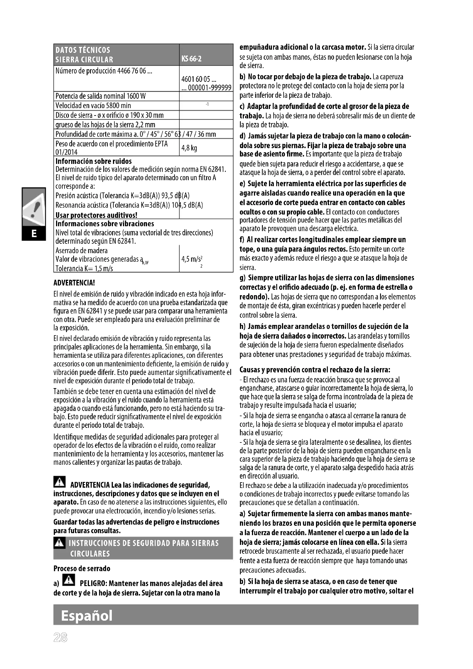 LABORALES ¡Utilice protección auditiva! La exposición a niveles de ruido excesivos puede causar la pérdida de audición. Utilice el equipamiento de protección. Mientras trabaje con la máquina lleve siempre gafas protectoras. Se recomienda utilizar ropa de protección como máscara protectora contra el polvo, guantes protectores, calzado resistente y antideslizante, casco y protección para los oídos. El polvo que se produce cuando se usa esta herramienta puede ser perjudicial para la salud. Use un sistema de absorción de polvo y utilice una máscara adecuada de protección contra el polvo. Limpie el polvo depositado, por ejemplo con un aspirador. No se pueden emplear hojas de sierra cuyos datos codicados no corresponden a estas instrucciones de manejo. Elegir la hoja de sierra adecuada para el material a cortar. Utilice únicamente hojas de carpintería, especicadas en este manual, que cumplan con la norma EN 847-1. Las revoluciones admisibles del útil deberán ser como mínimo iguales a las revoluciones máximas indicadas en la herramienta eléctrica. Por favor no emplear muelas abrasivas ! En cortes manuales ni se puede ni se debe enclavar el interruptor de forma ja, para prevenir accidentes.