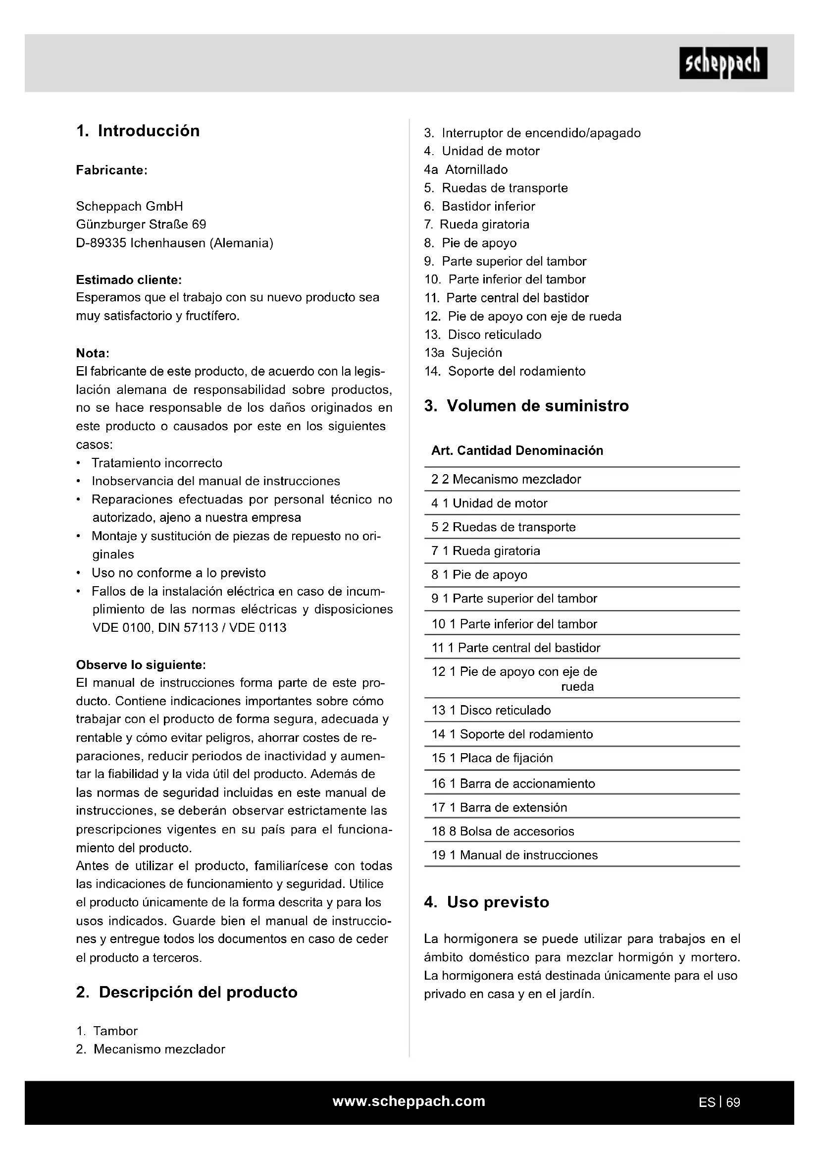 Fabricante: Scheppach GmbH Günzburger Straße 69 D-89335 Ichenhausen (Alemania) Estimado cliente: Esperamos que el trabajo con su nuevo producto sea muy satisfactorio y fructífero. Nota: El fabricante de este producto, de acuerdo con la legis- lación alemana de responsabilidad sobre productos, no se hace responsable de los daños originados en este producto o causados por este en los siguientes casos: