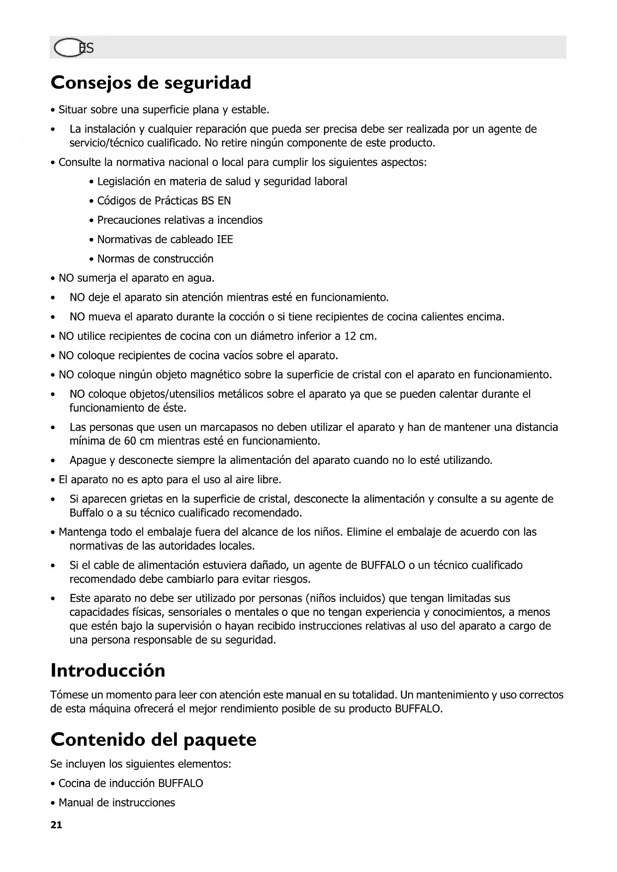 - Manual de instrucciones22 UKES Línea de atención telefónica: 0845 146 2887 (Reino Unido) RU BUFFALO está orgulloso de su calidad y servicio, y garantiza que en el momento del embalaje, el contenido del paquete es plenamente funcional y no presenta daños. Si descubriera algún daño como consecuencia del transporte, póngase en contacto con su distribuidor BUFFALO inmediatamente. Installation Mantenga una distancia de 15 cm (6 pulgadas) entre el aparato y las paredes u otros objetos. Funcionamiento Batería de cocina Los recipientes de cocina aptos incluyen: