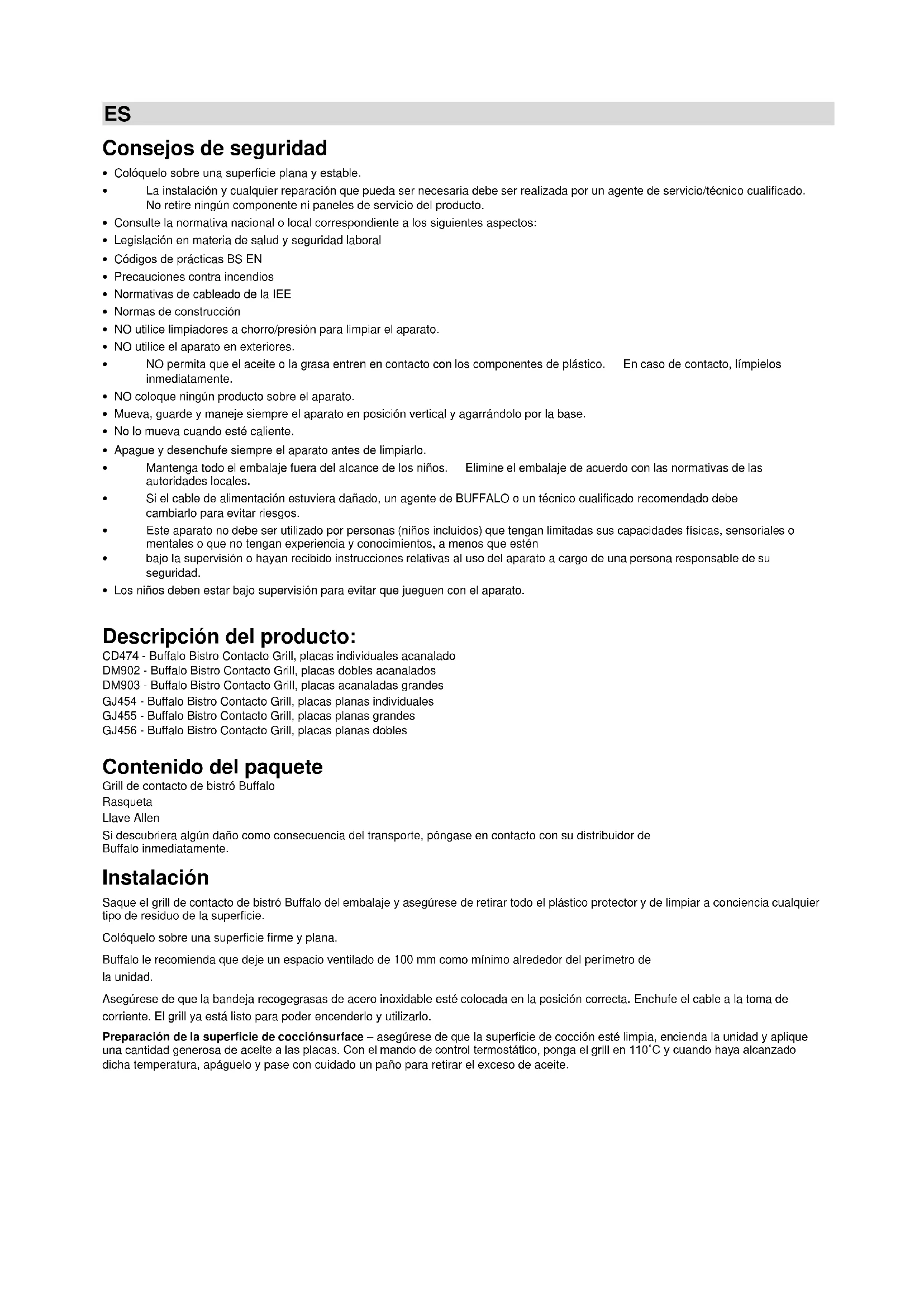 - Los niños deben estar bajo supervisión para evitar que jueguen con el aparato. Descripción del producto: CD474 - Buffalo Bistro Contacto Grill, placas individuales acanalado DM902 - Buffalo Bistro Contacto Grill, placas dobles acanalados DM903 - Buffalo Bistro Contacto Grill, placas acanaladas grandes GJ454 - Buffalo Bistro Contacto Grill, placas planas individuales GJ455 - Buffalo Bistro Contacto Grill, placas planas grandes GJ456 - Buffalo Bistro Contacto Grill, placas planas dobles Contenido del paquete Grill de contacto de bistró Buffalo Rasqueta Llave Allen Si descubriera algún daño como consecuencia del transporte, póngase en contacto con su distribuidor de Buffalo inmediatamente. Instalación Saque el grill de contacto de bistró Buffalo del embalaje y asegúrese de retirar todo el plástico protector y de limpiar a conciencia cualquier tipo de residuo de la superficie. Colóquelo sobre una superficie firme y plana. Buffalo le recomienda que deje un espacio ventilado de 100 mm como mínimo alrededor del perímetro de la unidad. Asegúrese de que la bandeja recogegrasas de acero inoxidable esté colocada en la posición correcta. Enchufe el cable a la toma de corriente. El grill ya está listo para poder encenderlo y utilizarlo. Preparación de la superficie de cocciónsurface – asegúrese de que la superficie de cocción esté limpia, encienda la unidad y aplique una cantidad generosa de aceite a las placas. Con el mando de control termostático, ponga el grill en 110˚C y cuando haya alcanzado dicha temperatura, apáguelo y pase con cuidado un paño para retirar el exceso de aceite.Línea de atención telefónica: 901 100 133 ES Funcionamiento Debe encender el grill de contacto 5 minutos antes de su uso como mínimo. Para sacarle el máximo partido a la unidad durante un uso intermitente, le aconsejamos que mantenga cerradas las placas del grill y que baje el termostato cuando no esté cocinando. Esto le ayudará a ahorrar energía y a obtener una respuesta térmica más rápida cuando lo necesite. Buffalo le recomienda que engrase ligeramente la superficie de cocción antes de cada uso. Una temperatura de entre 200 y 220°C será suficiente para una cocción general. Esto puede variar en el caso de tipos de alimentos particulares, las necesidades individuales o la experiencia. Sólo tiene que colocar los alimentos en la superficie de asar inferior, bajar la placa superior y guisar al gusto.