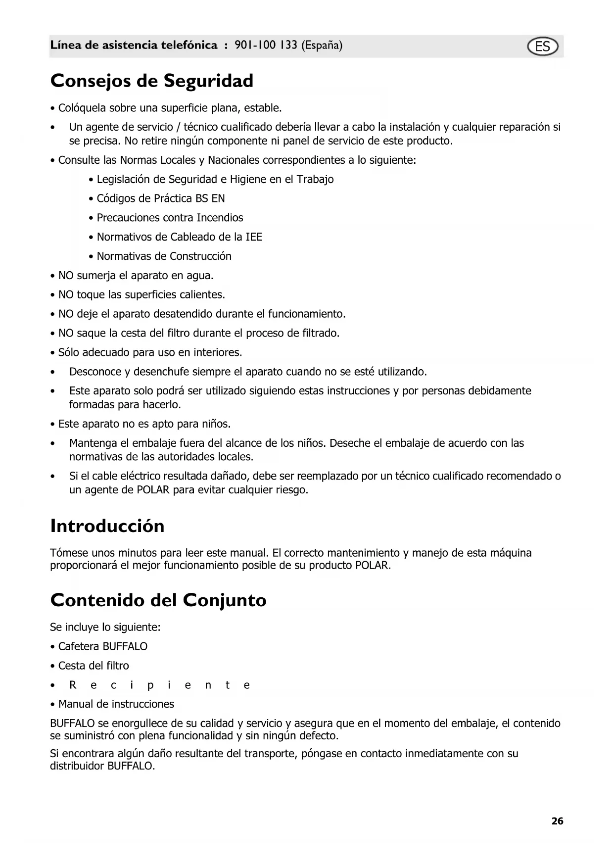Resolución de problemas Nota: utilice un producto adecuado para eliminar la cal y siga las instrucciones del recipiente. Nota: BUFFALLO recomienda que se elimine la cal de este aparato cada 3 meses o con mayor frecuencia en zonas de aguas duras. Fallo Probable Causa Acción El aparato no funciona El aparato no está conectado Compruebe que el aparato esté enchufado correctamente y conectado El enchufe y el cable están dañados Llame a un técnico cualificado o a un agente de POLAR El fusible del enchufe se ha fundido Cambie el fusible del enchufe Suministro eléctrico Compruebe el suministro eléctrico Fallo del cableado interno Llame a un técnico cualificado o a un agente de POLAR No sale café de la cesta del filtro No hay agua en el depósito Desconecte el aparato y llene el depósito El café es demasiado compacto dentro del filtro Desconecte el aparato, descompacte el café dentro del filtro y reanude el funcionamiento El aparato emite un fuerte ruido No hay agua en el depósito Desconecte el aparato y llene el depósito30
