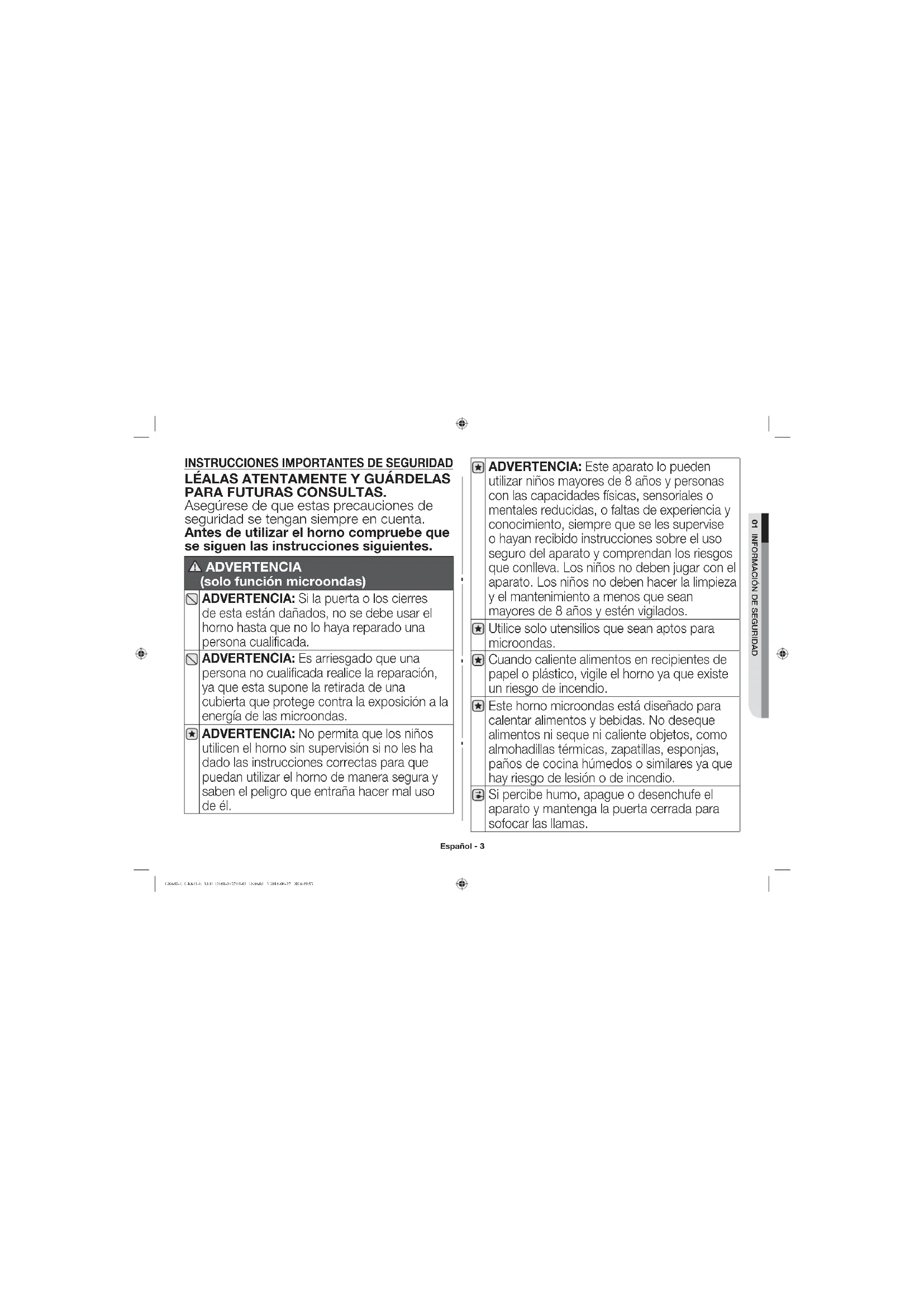 PARA FUTURAS CONSULTAS. Asegúrese de que estas precauciones de seguridad se tengan siempre en cuenta. Antes de utilizar el horno compruebe que se siguen las instrucciones siguientes. ADVERTENCIA (solo función microondas) ADVERTENCIA: Si la puerta o los cierres de esta están dañados, no se debe usar el horno hasta que no lo haya reparado una persona cualificada. ADVERTENCIA: Es arriesgado que una persona no cualificada realice la reparación, ya que esta supone la retirada de una cubierta que protege contra la exposición a la energía de las microondas. ADVERTENCIA: No permita que los niños utilicen el horno sin supervisión si no les ha dado las instrucciones correctas para que puedan utilizar el horno de manera segura y saben el peligro que entraña hacer mal uso de él. ADVERTENCIA: Este aparato lo pueden utilizar niños mayores de 8 años y personas con las capacidades físicas, sensoriales o mentales reducidas, o faltas de experiencia y conocimiento, siempre que se les supervise o hayan recibido instrucciones sobre el uso seguro del aparato y comprendan los riesgos que conlleva. Los niños no deben jugar con el aparato. Los niños no deben hacer la limpieza y el mantenimiento a menos que sean mayores de 8 años y estén vigilados. Utilice solo utensilios que sean aptos para microondas. Cuando caliente alimentos en recipientes de papel o plástico, vigile el horno ya que existe un riesgo de incendio. Este horno microondas está diseñado para calentar alimentos y bebidas. No deseque alimentos ni seque ni caliente objetos, como almohadillas térmicas, zapatillas, esponjas, paños de cocina húmedos o similares ya que hay riesgo de lesión o de incendio. Si percibe humo, apague o desenchufe el aparato y mantenga la puerta cerrada para sofocar las llamas. GK640-E_GK641-E_XEU_DE68-04279B-01_ES.indd 3 2014-06-27 6:49:53Español - 4 Este electrodoméstico no está pensado para que lo usen personas (incluidos los niños) con las capacidades físicas, sensoriales o mentales reducidas, o faltas de experiencia y conocimientos, a menos que sean supervisadas o que hayan recibido instrucciones sobre el uso del electrodoméstico por parte de una persona responsable de su seguridad. No deje que los niños jueguen con el electrodoméstico. Si el cable de alimentación está deteriorado, a fin de evitar incidentes deberá sustituirlo el fabricante, un técnico de servicio autorizado o una persona igualmente cualificada. ADVERTENCIA: Los líquidos y otros alimentos no deben calentarse en recipientes cerrados, ya que tienen tendencia a explotar. No debe limpiar el aparato con un chorro de agua. El horno debe estar colocado en la posición correcta y a una altura que permita el fácil acceso a su interior y a los controles. ADVERTENCIA: El calentamiento de bebidas con el microondas puede provocar ebulliciones eruptivas con retraso. Por lo tanto, tenga cuidado al manejar el recipiente. ADVERTENCIA: El contenido de los biberones y de los tarros de papilla debe agitarse o removerse y comprobar su temperatura antes de dárselo al niño para evitar que se queme. No caliente en el microondas huevos con cáscara o cocidos, ya que podrían explotar aun después de finalizar el tiempo de calentamiento. Limpie el horno con regularidad y retire cualquier resto de comida. Si no mantiene el horno limpio puede que se dañe la superficie, lo que podría restar efectividad a la vida del aparato y provocar riesgos innecesarios. El electrodoméstico no está preparado para instalarlo en vehículos, caravanas o similares. GK640-E_GK641-E_XEU_DE68-04279B-01_ES.indd 4 2014-06-27 6:49:53Español - 5