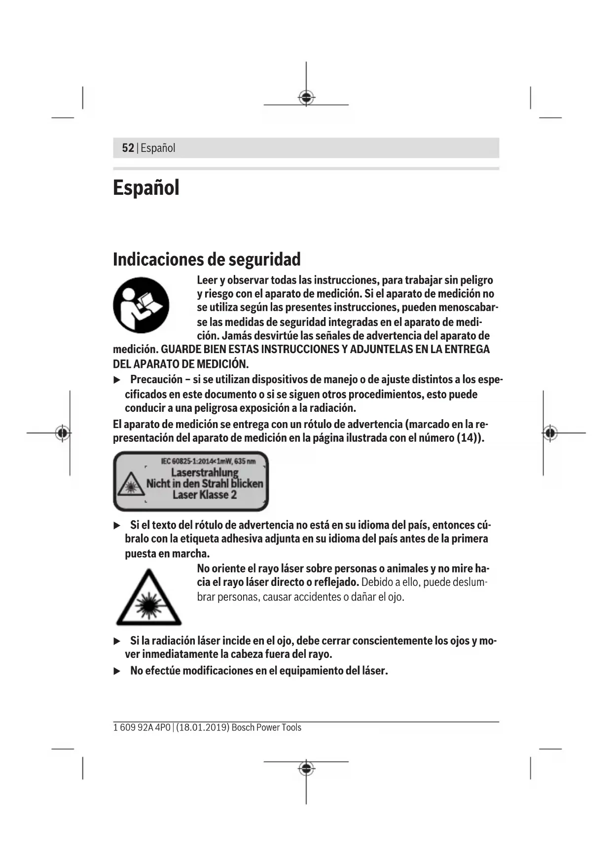 Banda de frecuencia de funcionamiento 2402 – 2480 MHz 2402 – 2480 MHz Potencia de emisión máx. 2,5 mW 2,5 mW A) En el caso de mediciones desde el borde trasero del aparato de medición. El alcance aumenta, cuanto mejor retorna la luz láser de la superficie del objetivo (dispersante, no reflejante) y cuan- to más claro es el punto láser en comparación a la claridad del entorno (espacios interiores, cre- púsculo). Para distancias inferiores a 20m no se debería utilizar un tablilla objetivo retroreflec- tante, ya que puede conducir a errores de medición. B) En el caso de mediciones desde el borde trasero del aparato de medición, 100% de reflexión del objetivo (p. ej. una pared pintada, blanca), débil iluminación de fondo y 25°C de temperatu- ra de servicio. Adicionalmente se debe contar con una influencia de ±0,05mm/m. C) Sólo se produce un ensuciamiento no conductor, sin embargo ocasionalmente se espera una conductividad temporal causada por la condensación. D) en función del tipo de superficie y las condiciones del entorno E) A 25 °C de temperatura de servicio F) Bluetooth® desactivado G) En los aparatos Bluetooth®-Low-Energy, según el modelo y el sistema operativo, es posible que no se pueda establecer una comunicación. Los aparatos Bluetooth® deben apoyar el perfil SPP. Para la identificación unívoca de su aparato de medición sirve el número de referencia (11) en la placa de características. Montaje Colocar/cambiar las pilas Se recomienda utilizar pilas alcalinas de manganeso, o acumuladores, en el aparato de medición. 1 609 92A 4P0 | (18.01.2019) Bosch Power ToolsEspañol | 57 Con acumuladores de 1,2V se pueden realizar menos mediciones que con pilas de 1,5V. Para abrir la tapa del compartimento de la batería (9), pulse el bloqueo (10) en direc- ción de la flecha y extraiga la tapa del compartimento de las pilas. Coloque las pilas o los acumuladores. Observe en ello la polaridad correcta conforme a la representación en el lado interior del compartimiento de pilas. Cuando aparece por primera vez el símbolo de la batería en la pantalla, todavía se pueden realizar como mínimo 100 mediciones. Cuando el símbolo de pila está vacío, se tienen que cambiar las pilas o el acumulador; ya no se pueden realizar mediciones. Siempre sustituya todas las pilas o acumuladores al mismo tiempo. Solamente utilice pi- las o acumuladores del mismo fabricante e igual capacidad. u Retire las pilas o los acumuladores del aparato de medición, si no va a utilizarlo durante un periodo prolongado. Tras un tiempo de almacenaje prolongado, las pilas y los acumuladores se pueden llegar a corroer o autodescargar. Operación Puesta en marcha u No deje sin vigilancia el aparato de medición encendido y apague el aparato de medición después del uso. El rayo láser podría deslumbrar a otras personas. u Proteja el aparato de medición de la humedad y de la exposición directa al sol. u No exponga el aparato de medición a temperaturas extremas o fluctuaciones de temperatura. No la deje, por ejemplo, durante un tiempo prolongado en el automóvil. En caso de fuertes fluctuaciones de temperatura, deje que se estabilice primero la temperatura de la herramienta de medición antes de la puesta en servicio. Las tempe- raturas extremas o los cambios bruscos de temperatura pueden afectar a la exactitud del aparato de medición. u Evite que el aparato de medición reciba golpes o que se caiga. Tras fuertes in- fluencias externas en el aparato de medición, realice siempre un control de precisión antes de continuar con el trabajo (ver "Verificación de precisión del aparato de medi- ción", Página65). Interruptor de conexión/desconexión Para encender el aparato de medición, pulse brevemente la tecla de conexión/descone- xión (8) o la tecla de medición (4). Al conectar el aparato de medición no se conecta aún el rayo láser. Bosch Power Tools 1 609 92A 4P0 | (18.01.2019)58 | Español Para apagar el aparato de medición, mantenga pulsada la tecla de conexión/descone- xión (8). Si no se presiona ninguna tecla del aparato de medición durante aprox. 5 minutos, en- tonces el aparato de medición se apaga automáticamente para proteger las pilas. Proceso de medición Tras la conexión, el aparato de medición se encuentra en la función de medición de longitudes. Puede ajustar otras funciones de medi- ción pulsando la tecla (2)(ver "Funciones de medición", Página59). Tras la confirmación de la función de medición con la tecla de medi- ción (4) se conecta el rayo láser. Al conectar el aparato de medición, el canto posterior de éste es se- leccionado automáticamente como plano de referencia. Para cambiar el plano de refe- rencia seleccionar (ver "Seleccionar el plano de referencia (ver figuras A–B)", Pági- na58). Coloque el aparato de medición con el plano de referencia seleccionado en la línea de medición deseada (p. ej. pared). Para activar la medición, presione brevemente la tecla de medición (4). A continuación, se desconecta el rayo láser. Para conectar de nuevo el rayo láser, presione brevemente la tecla de medición (4). Para activar otra medición, presione de nuevo brevemente la te- cla de medición (4). u No oriente el rayo láser contra personas ni animales, ni mire directamente hacia el rayo láser, incluso encontrándose a gran distancia. En la función de medición permanente, la medición comienza tras la primera pulsación de la tecla de medición (4). El valor de medición aparece típicamente dentro de 0,5s y, a más tardar, tras 4s. La du- ración de medición es dependiente de la distancia, las condiciones de luz y las caracte- rísticas de reflexión de la superficie del objetivo. Si no tiene lugar ninguna medición aprox. 20segundos tras el avistamiento, se desco- necta automáticamente el rayo láser para proteger las pilas. Seleccionar el plano de referencia (ver figuras A–B) Para la medición puede elegirse entre dos planos de refere