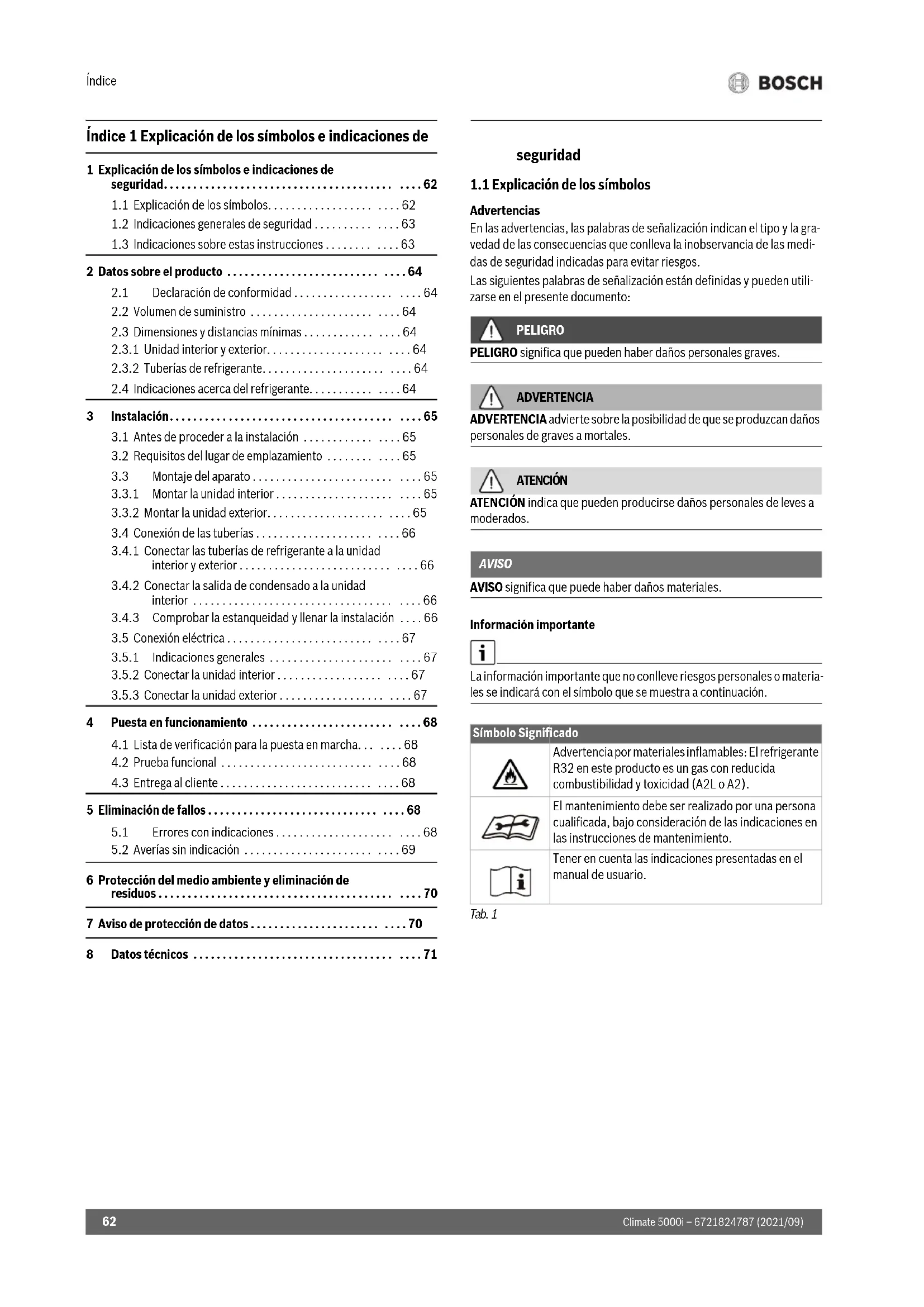 Advertencias En las advertencias, las palabras de señalización indican el tipo y la gra- vedad de las consecuencias que conlleva la inobservancia de las medi- das de seguridad indicadas para evitar riesgos. Las siguientes palabras de señalización están definidas y pueden utili- zarse en el presente documento: PELIGRO PELIGRO significa que pueden haber daños personales graves. ADVERTENCIA ADVERTENCIA advierte sobre la posibilidad de que se produzcan daños personales de graves a mortales. ATENCIÓN ATENCIÓN indica que pueden producirse daños personales de leves a moderados. AVISO AVISO significa que puede haber daños materiales. Información importante La información importante que no conlleve riesgos personales o materia- les se indicará con el símbolo que se muestra a continuación. Tab. 1 1 Explicación de los símbolos e indicaciones de seguridad. . . . . . . . . . . . . . . . . . . . . . . . . . . . . . . . . . . . . . . . . . . 62