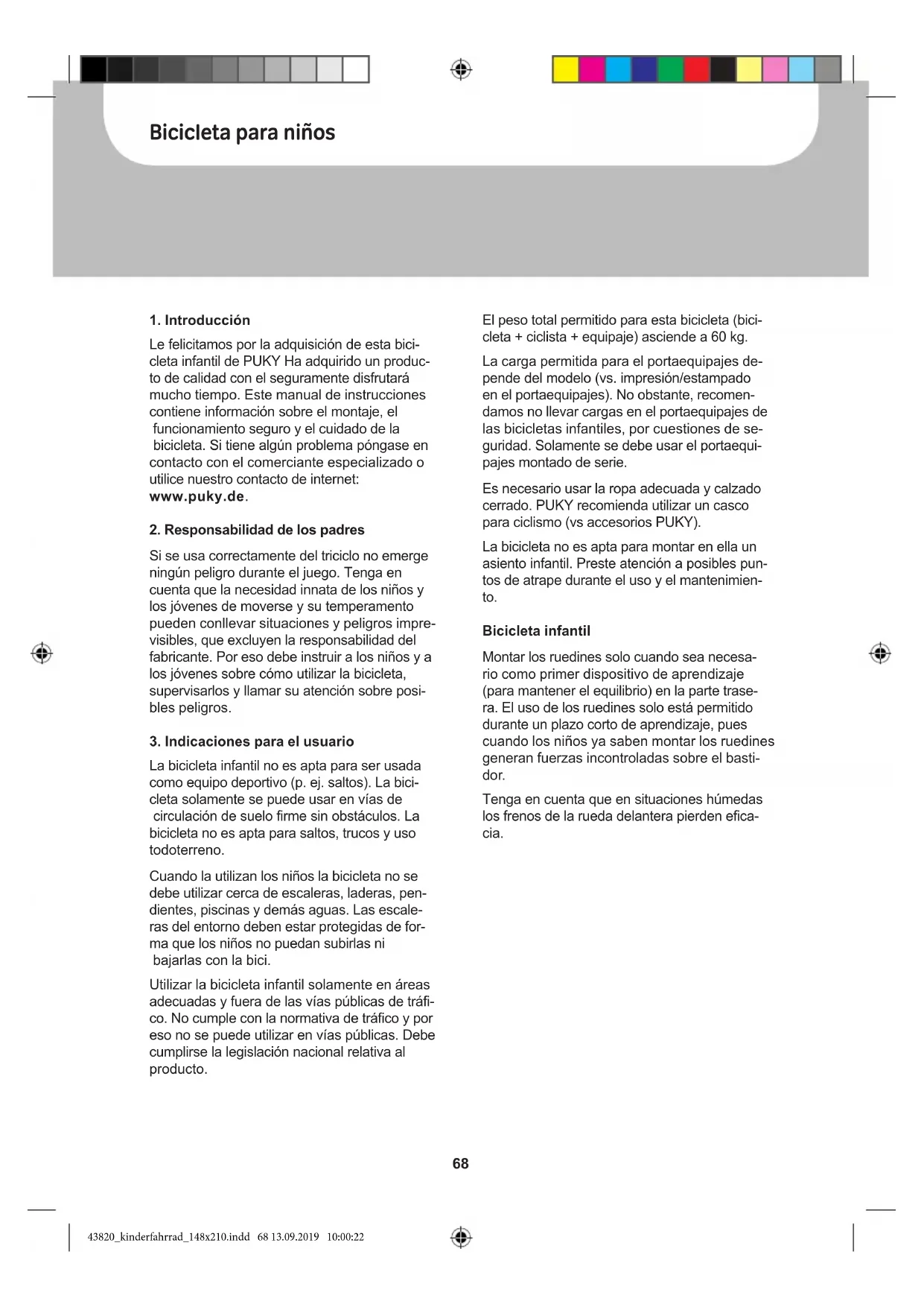 Le felicitamos por la adquisición de esta bici- cleta infantil de PUKY Ha adquirido un produc- to de calidad con el seguramente disfrutará mucho tiempo. Este manual de instrucciones contiene información sobre el montaje, el funcionamiento seguro y el cuidado de la bicicleta. Si tiene algún problema póngase en contacto con el comerciante especializado o utilice nuestro contacto de internet: www.puky.de.