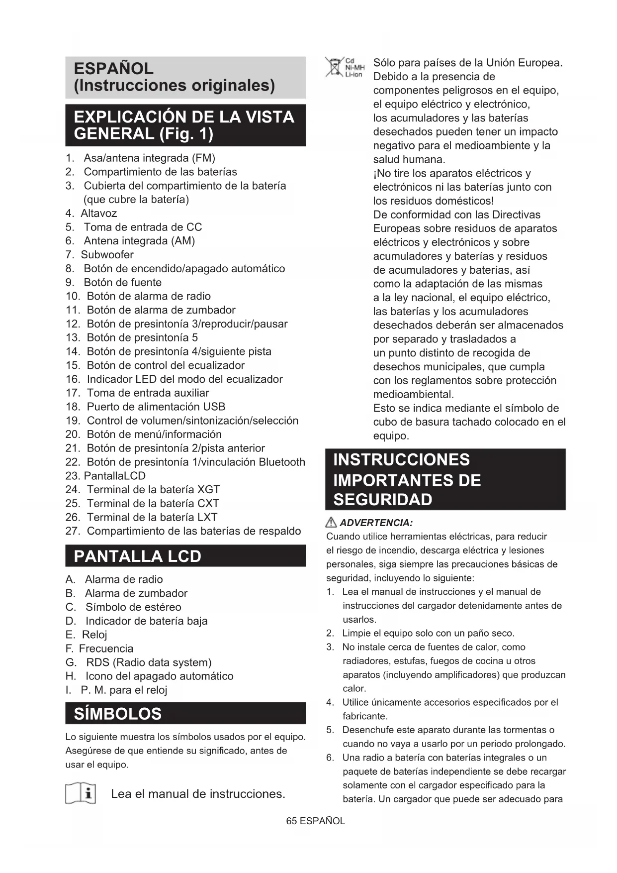 SÍMBOLOS Lo siguiente muestra los símbolos usados por el equipo. Asegúrese de que entiende su significado, antes de usar el equipo. Lea el manual de instrucciones. Sólo para países de la Unión Europea. Debido a la presencia de componentes peligrosos en el equipo, el equipo eléctrico y electrónico, los acumuladores y las baterías desechados pueden tener un impacto negativo para el medioambiente y la salud humana. ¡No tire los aparatos eléctricos y electrónicos ni las baterías junto con los residuos domésticos! De conformidad con las Directivas Europeas sobre residuos de aparatos eléctricos y electrónicos y sobre acumuladores y baterías y residuos de acumuladores y baterías, así como la adaptación de las mismas a la ley nacional, el equipo eléctrico, las baterías y los acumuladores desechados deberán ser almacenados por separado y trasladados a un punto distinto de recogida de desechos municipales, que cumpla con los reglamentos sobre protección medioambiental. Esto se indica mediante el símbolo de cubo de basura tachado colocado en el equipo. INSTRUCCIONES IMPORTANTES DE SEGURIDAD ADVERTENCIA: Cuando utilice herramientas eléctricas, para reducir el riesgo de incendio, descarga eléctrica y lesiones personales, siga siempre las precauciones básicas de seguridad, incluyendo lo siguiente: