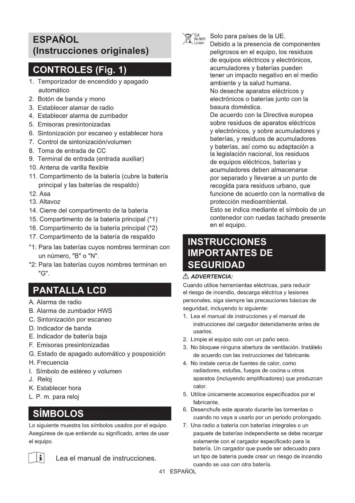 J. Reloj K. Establecer hora L. P. m. para reloj SÍMBOLOS Lo siguiente muestra los símbolos usados por el equipo. Asegúrese de que entiende su significado, antes de usar el equipo. Lea el manual de instrucciones. Solo para países de la UE. Debido a la presencia de componentes peligrosos en el equipo, los residuos de equipos eléctricos y electrónicos, acumuladores y baterías pueden tener un impacto negativo en el medio ambiente y la salud humana. No deseche aparatos eléctricos y electrónicos o baterías junto con la basura doméstica. De acuerdo con la Directiva europea sobre residuos de aparatos eléctricos y electrónicos, y sobre acumuladores y baterías, y residuos de acumuladores y baterías, así como su adaptación a la legislación nacional, los residuos de equipos eléctricos, baterías y acumuladores deben almacenarse por separado y llevarse a un punto de recogida para residuos urbano, que funcione de acuerdo con la normativa de protección medioambiental. Esto se indica mediante el símbolo de un contenedor con ruedas tachado presente en el equipo. INSTRUCCIONES IMPORTANTES DE SEGURIDAD ADVERTENCIA: Cuando utilice herramientas eléctricas, para reducir el riesgo de incendio, descarga eléctrica y lesiones personales, siga siempre las precauciones básicas de seguridad, incluyendo lo siguiente: