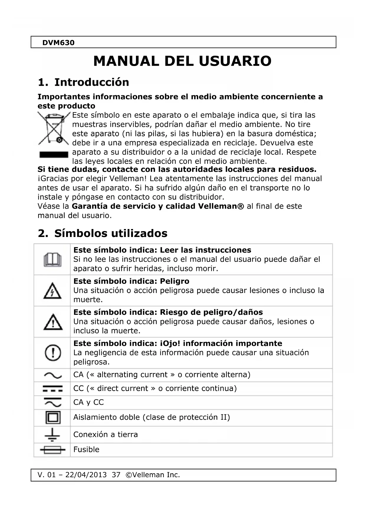 Descarga las instrucciones para tu Multímetro en formato PDF gratis! Encuentra tus instrucciones DVM630 - VELLEMAN y toma tu dispositivo electrónico nuevamente en la mano. En esta página están publicados todos los documentos necesarios para el uso de su dispositivo. DVM630 de la marca VELLEMAN.