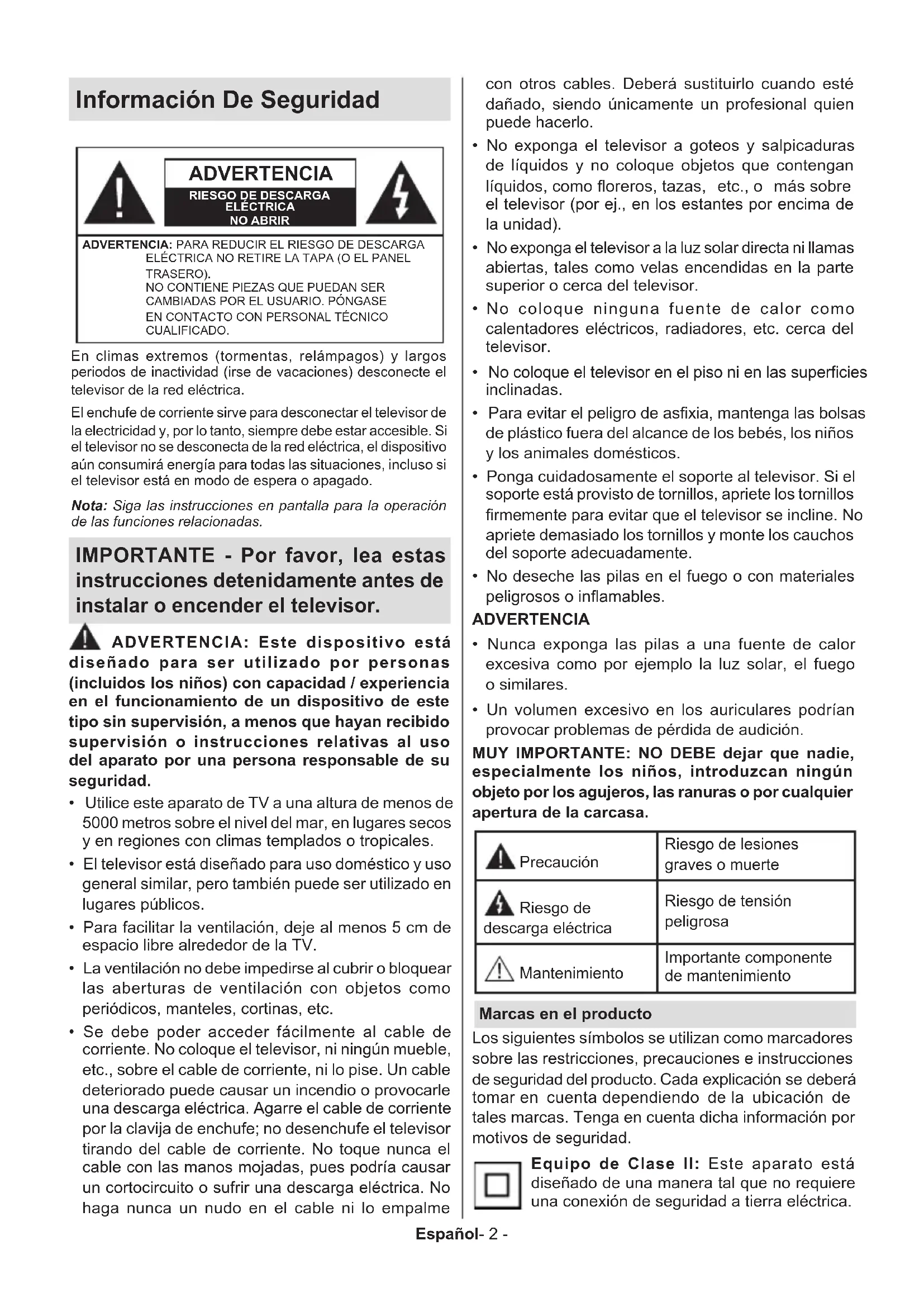 Gracias por haber elegido nuestro producto. Pronto disfrutaras de su nuevo TV. Por favor, lea detenidamente estas instrucciones Ls instructaciones contienen informacion importante que le ayudar a Obtener lo mejor de su TV y garantizar una instalacion y operation correcta y segura.