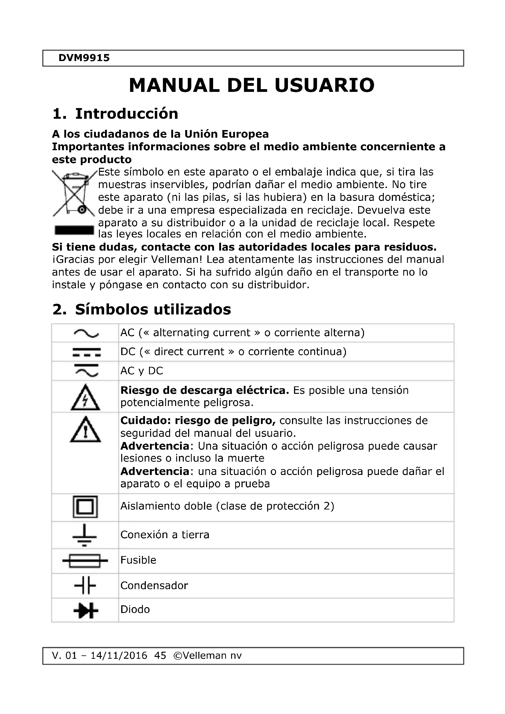 Descarga las instrucciones para tu Multímetro en formato PDF gratis! Encuentra tus instrucciones DVM9915 - VELLEMAN y toma tu dispositivo electrónico nuevamente en la mano. En esta página están publicados todos los documentos necesarios para el uso de su dispositivo. DVM9915 de la marca VELLEMAN.