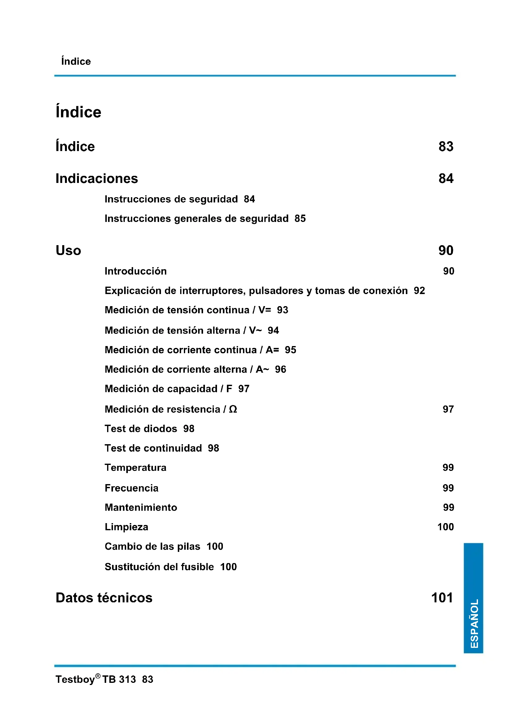 TB 313 83 ESPAÑOL Índice Índice 83 Indicaciones 84 Instrucciones de seguridad 84 Instrucciones generales de seguridad 85 Uso 90 Introducción 90 Explicación de interruptores, pulsadores y tomas de conexión 92 Medición de tensión continua / V= 93 Medición de tensión alterna / V~ 94 Medición de corriente continua / A= 95 Medición de corriente alterna / A~ 96 Medición de capacidad / F 97 Medición de resistencia / Ω 97 Test de diodos 98 Test de continuidad 98 Temperatura 99 Frecuencia 99 Mantenimiento 99 Limpieza 100 Cambio de las pilas 100 Sustitución del fusible 100 Datos técnicos 101Indicaciones 84 Testboy