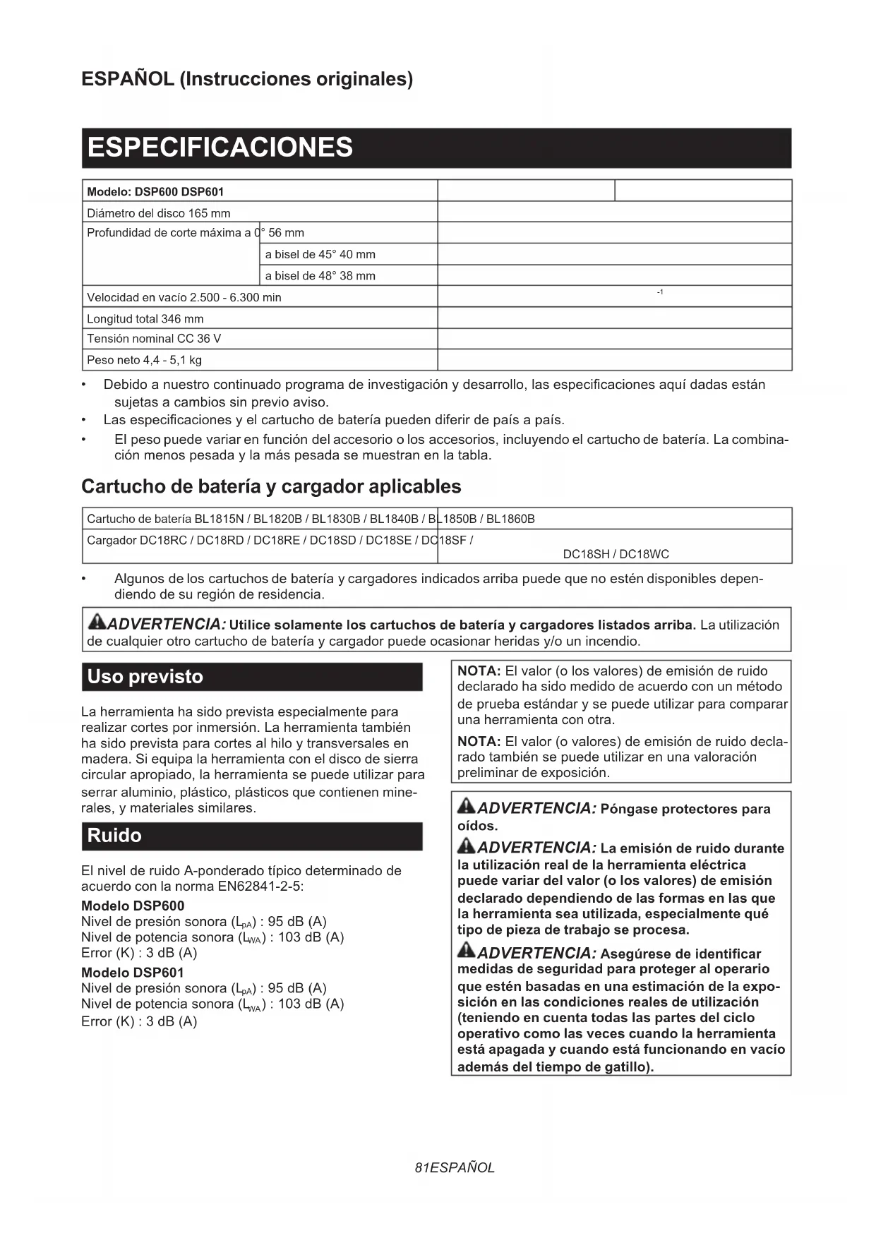 - Algunosdeloscartuchosdebateríaycargadoresindicadosarribapuedequenoesténdisponiblesdepen- diendo de su región de residencia. ADVERTENCIA: Utilice solamente los cartuchos de batería y cargadores listados arriba.Lautilización decualquierotrocartuchodebateríaycargadorpuedeocasionarheridasy/ounincendio. Uso previsto La herramienta ha sido prevista especialmente para realizarcortesporinmersión.Laherramientatambién hasidoprevistaparacortesalhiloytransversalesen madera. Si equipa la herramienta con el disco de sierra circularapropiado,laherramientasepuedeutilizarpara serrar aluminio, plástico, plásticos que contienen mine- rales,ymaterialessimilares. Ruido ElnivelderuidoA-ponderadotípicodeterminadode acuerdo con la norma EN62841-2-5: Modelo DSP600 Niveldepresiónsonora(L