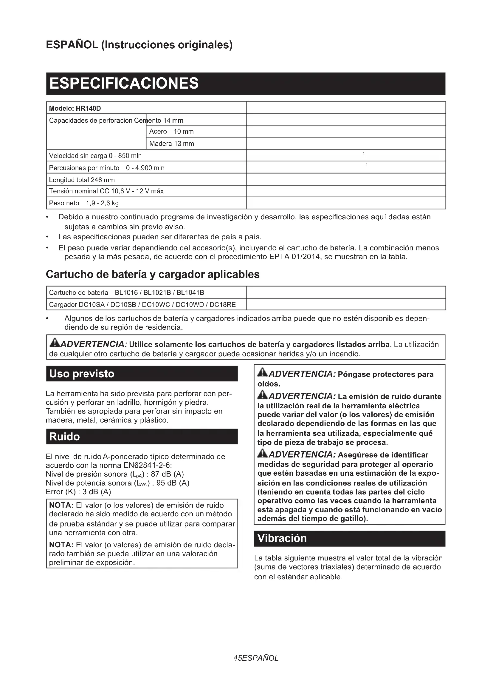 - Algunosdeloscartuchosdebateríaycargadoresindicadosarribapuedequenoesténdisponiblesdepen- diendo de su región de residencia. ADVERTENCIA: Utilice solamente los cartuchos de batería y cargadores listados arriba. La utilización decualquierotrocartuchodebateríaycargadorpuedeocasionarheridasy/ounincendio. Uso previsto La herramienta ha sido prevista para perforar con per- cusiónyperforarenladrillo,hormigónypiedra. Tambiénesapropiadaparaperforarsinimpactoen madera,metal,cerámicayplástico. Ruido ElnivelderuidoA-ponderadotípicodeterminadode acuerdoconlanormaEN62841-2-6: Niveldepresiónsonora(L