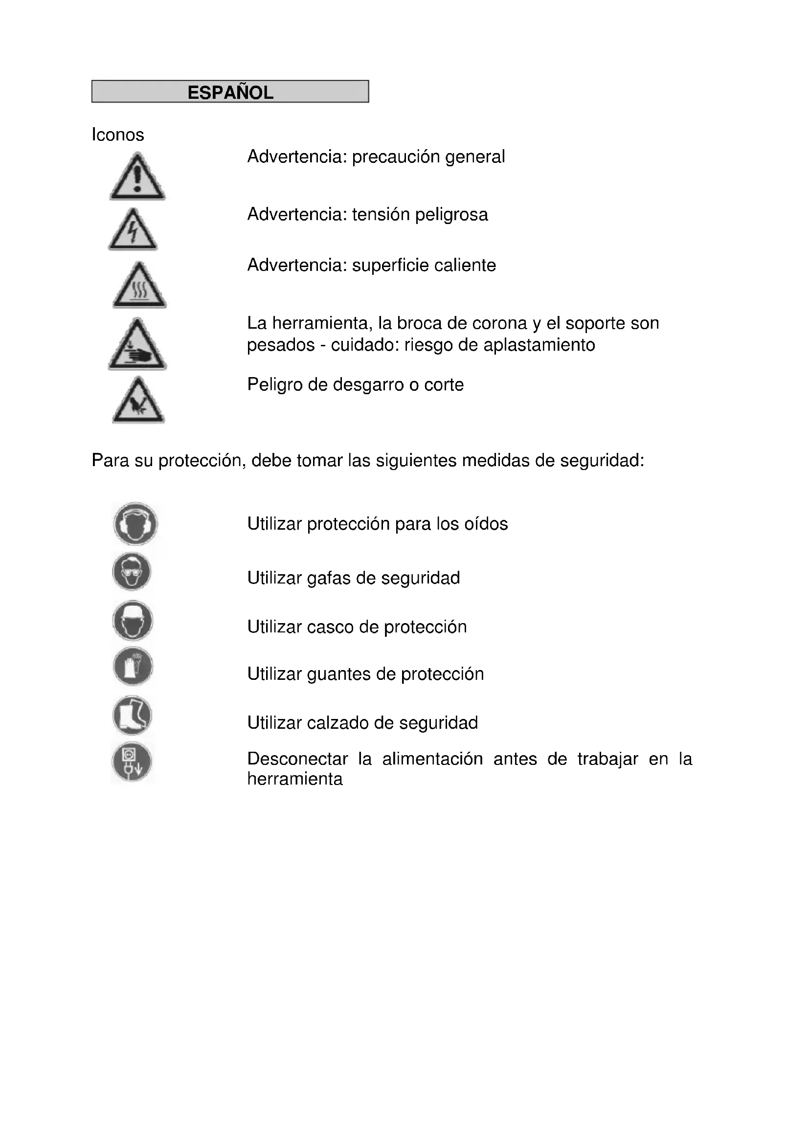 No exponga la herramienta directamente a la lluvia. No utilice la herramienta en zonas donde exista peligro de explosión. No utilice la herramienta subido a una escalera. No deben perforarse materiales que contengan amianto. No lleve nunca la herramienta del cable. Antes de utilizarla, compruebe la herramienta, el cable y la clavija. Los daños deben ser reparados por un especialista autorizado. Asegúrese de que la herramienta está apagada antes de conectarla a la toma de corriente. La manipulación de la herramienta dará lugar a una anulación de la garantía. Durante su uso, la herramienta debe estar en todo momento bajo supervisión constante. La herramienta debe apagarse y desconectarse de la corriente cuando no esté bajo supervisión, cuando se esté montando o desmontando, en caso de caídas de tensión o al fijar o montar los accesorios. Si el motor se para durante el uso, apague la herramienta. Con esto evitará que el motor se vuelva a poner en marcha de forma imprevista. No utilice la herramienta si alguna parte de la carcasa, el interruptor, el cable de alimentación o la clavija está dañada. Las herramientas eléctricas deben ser inspeccionadas visualmente por un especialista regularmente. Al utilizar el taladro, el agua de refrigeración debe mantenerse en todo momento fuera del motor y las piezas eléctricas. La erforación hacia arriba sólo debe realizarse si se cumplen las precauciones de seguridad adecuadas (recogida de agua). Deje de utilizar la herramienta si detecta una fuga de agua entre la carcassa de engranajes y la arandela sintética y lleve la herramienta a un servicio técnico autorizado. Después de una interrupción del funcionamiento, el motor sólo debe volver a ponerse en marcha de nuevo si la broca de corona puede girar libremente. Al utilizar la herramienta lleve siempre protección para los oídos. No toque las partes giratorias. Los menores de 16 años no deben utilizar la herramienta.