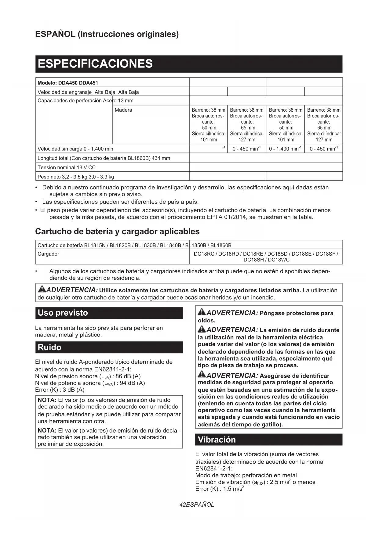 - Algunos de los cartuchos de batería y cargadores indicados arriba puede que no estén disponibles depen- diendo de su región de residencia. ADVERTENCIA: Utilice solamente los cartuchos de batería y cargadores listados arriba. La utilización de cualquier otro cartucho de batería y cargador puede ocasionar heridas y/o un incendio. Uso previsto La herramienta ha sido prevista para perforar en madera,metalyplástico. Ruido El nivel de ruido A-ponderado típico determinado de acuerdo con la norma EN62841-2-1: Nivel de presión sonora (L