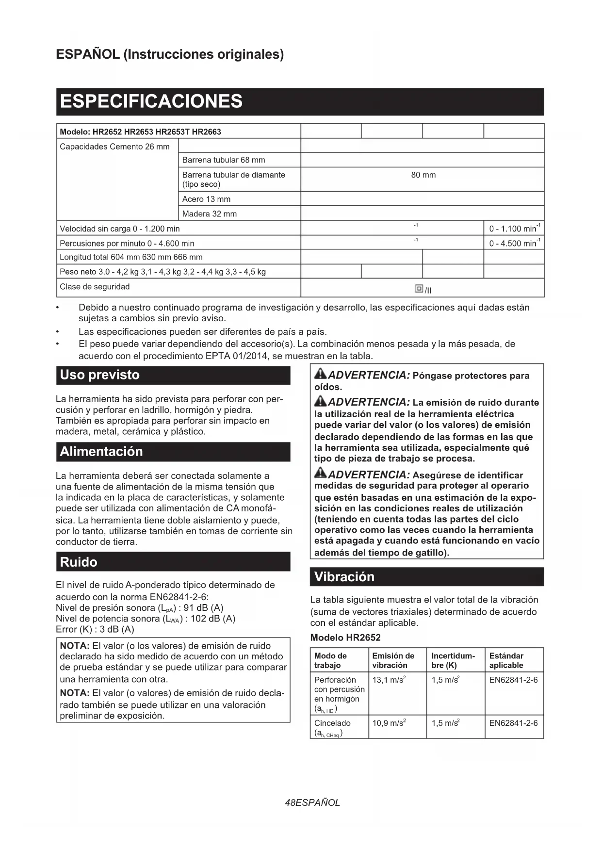 Modelo HR2653 Modo de trabajoEmisión de vibraciónIncertidum-bre (K)Estándar aplicablePerforación con percusión en hormigón h, HD 11,2 m/s 1,5 m/s EN62841-2-6Cincelado h, CHeq 9,3 m/s 1,5 m/s EN62841-2-6 Modelo HR2653T Modo de trabajoEmisión de vibraciónIncertidum-bre (K)Estándar aplicablePerforación con percusión en hormigón h, HD 10,9 m/s 1,5 m/s EN62841-2-6Cincelado h, CHeq 9,6 m/s 1,5 m/s EN62841-2-6 Modelo HR2663 Modo de trabajoEmisión de vibraciónIncertidum-bre (K)Estándar aplicablePerforación con percusión en hormigón h, HD 9,3 m/s 1,5 m/s EN62841-2-6Cincelado h, CHeq 7,0 m/s 1,5 m/s EN62841-2-6 NOTA: El valor (o los valores) total de emisión de vibración declarado ha sido medido de acuerdo con unmétododepruebaestándarysepuedeutilizar para comparar una herramienta con otra. NOTA: El valor (o los valores) total de emisión de vibracióndeclaradotambiénsepuedeutilizarenuna valoración preliminar de exposición. ADVERTENCIA: La emisión de vibración durante la utilización real de la herramienta eléc- trica puede variar del valor (o los valores) de emi- sión declarado dependiendo de las formas en las que la herramienta sea utilizada, especialmente qué tipo de pieza de trabajo se procesa. ADVERTENCIA: Asegúrese de identicar medidas de seguridad para proteger al operario que estén basadas en una estimación de la expo- sición en las condiciones reales de utilización (teniendo en cuenta todas las partes del ciclo operativo como las veces cuando la herramienta está apagada y cuando está funcionando en vacío además del tiempo de gatillo). Declaración CE de conformidad Para países europeos solamente LadeclaraciónCEdeconformidadestáincluidacomo Anexo A de esta manual de instrucciones. ADVERTENCIAS DE SEGURIDAD Advertencias de seguridad para herramientas eléctricas en general ADVERTENCIA: Lea todas las advertencias de seguridad, instrucciones, ilustraciones y espe- cicaciones provistas con esta herramienta eléc- trica. Si no sigue todas las instrucciones indicadas abajopodráresultarenunadescargaeléctrica,un incendio y/o heridas graves. Guarde todas las advertencias e instrucciones para futuras referencias. El término “herramienta eléctrica” en las advertencias sereereasuherramientaeléctricadefunciona- miento con conexión a la red eléctrica (con cable) o herramientaeléctricadefuncionamientoabatería(sin cable).
